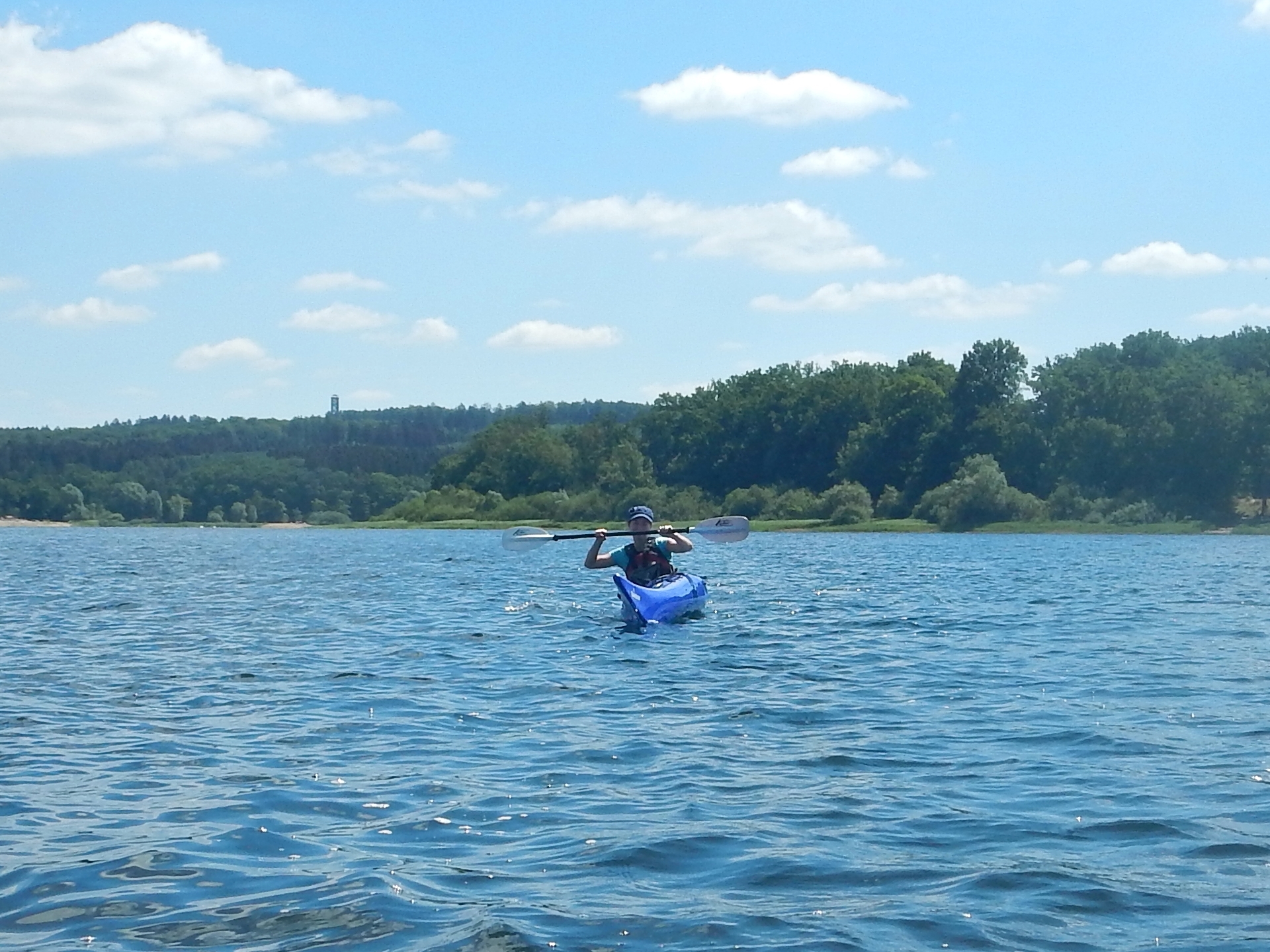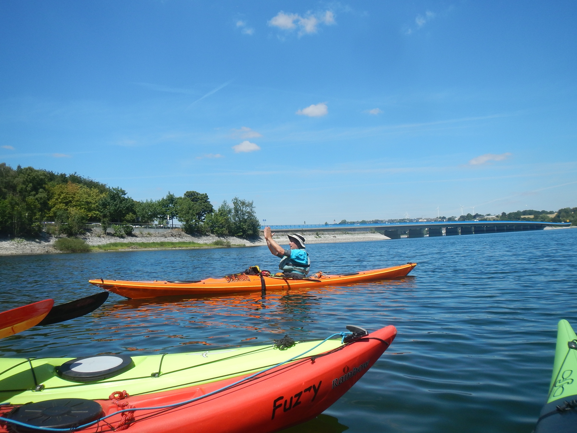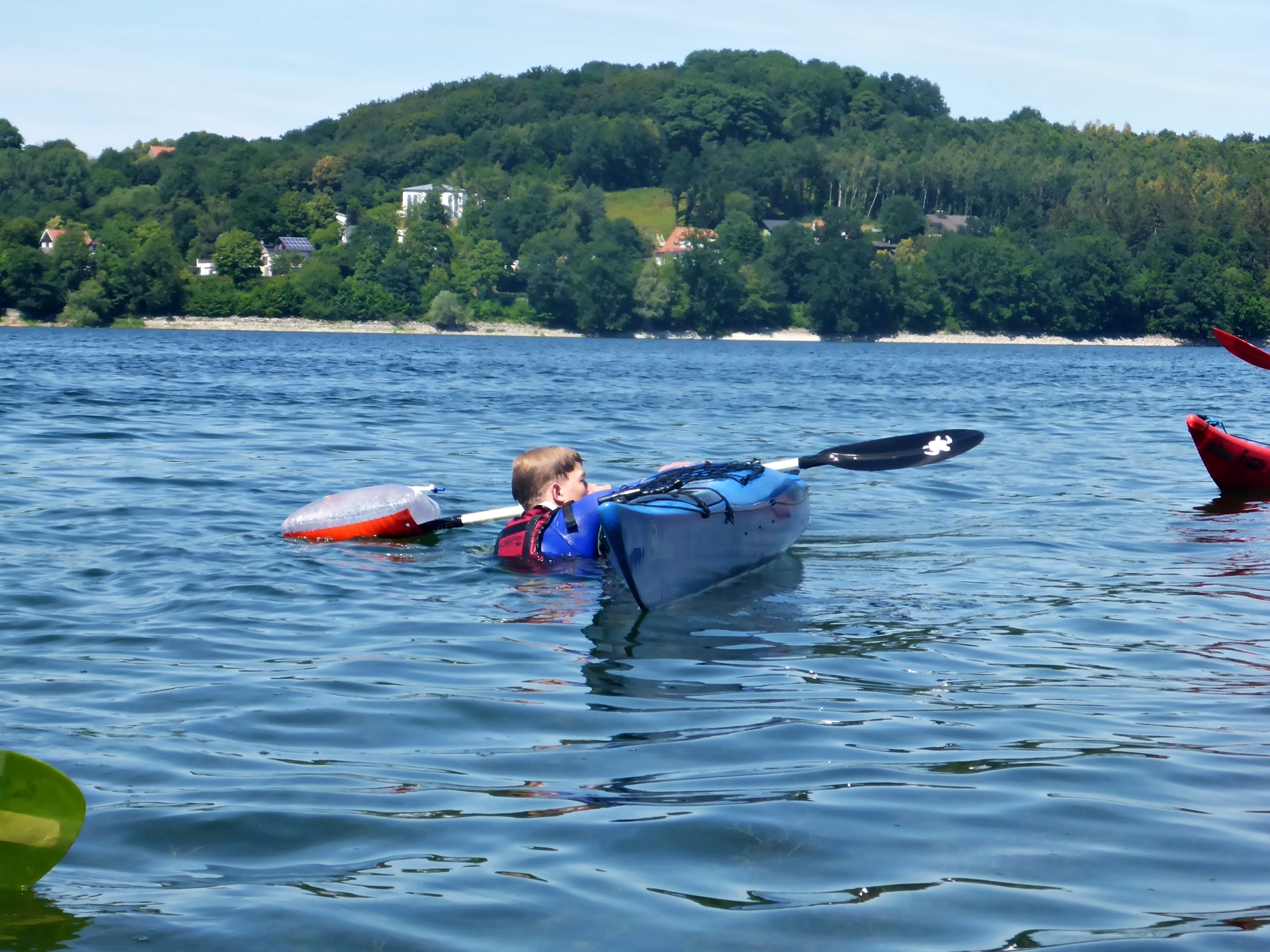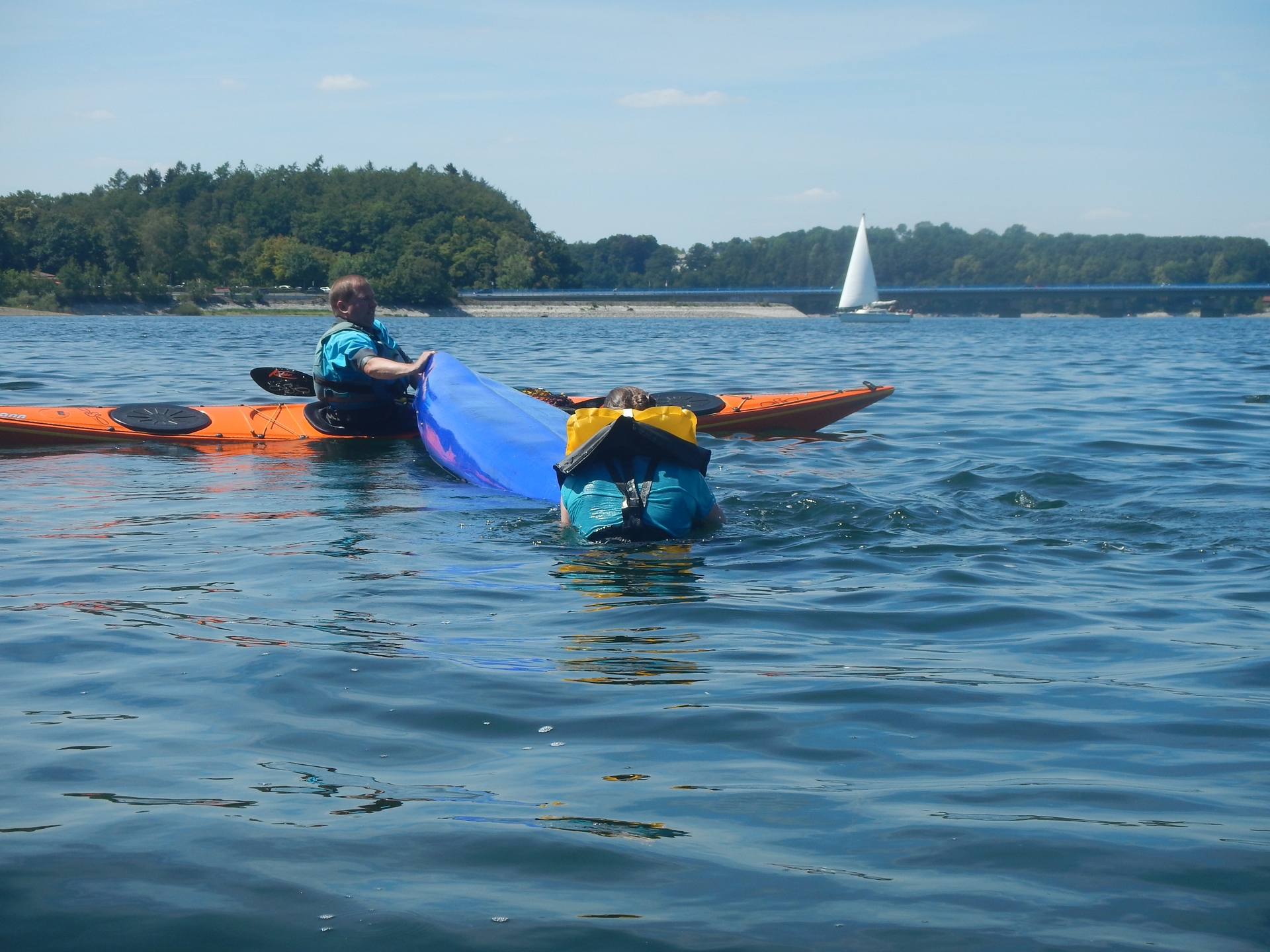 Anschließend ging es für den Praxisteil mit den Booten auf den Möhnesee. Hier wurde im Hinblick auf die Seekajak-Paddeltechniken u.a. das Kurvefahren mit Ankanten in einem kleinen Slalomparcours geübt. Danach ging es um Rettungstechniken, wie beispielsweise verschiedene Möglichkeiten, nach einer Kenterung wieder ins Boot zu gelangen und das Boot zu lenzen. Die Teilnehmer/innen konnten dies alles jeweils als Rettende und als Gekenterte üben. Trainiert wurden auch Schlepptechniken mit Schleppleine oder Bergegurtsystem. Zwei freiwillige Teilnehmer hatten zudem die Möglichkeit, speziellere Hilfsmittel wie das Paddelfloat als Einstiegshilfe und eine selbstaufblasende Rettungsweste einmal auszuprobieren.