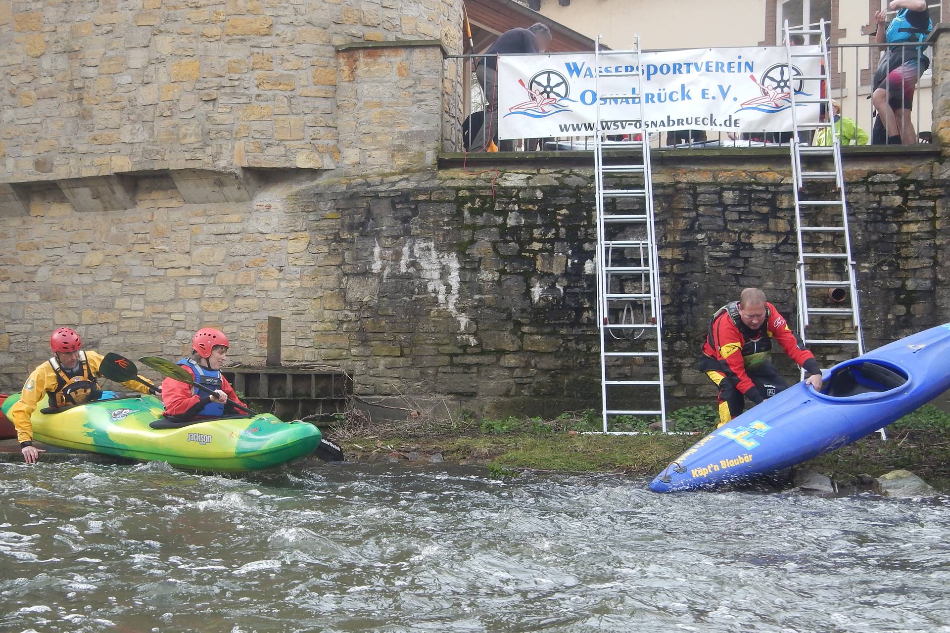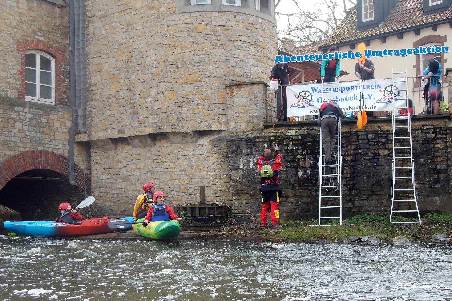 Nachdem sich alle am Bootshaus des WSVs getroffen und ihre trockenen Sachen dort deponiert hatten, ging es los zum Einstieg, wo nach der Begrüßung nach und nach die Boote zu Wasser gelassen wurden. Schnell hatte sich das Teilnehmerfeld auseinandergezogen, aber an der Pausenstelle Pernickelmühle nach ca. 10 km sammelten sich die Paddler wieder. Dort musste eine Wehranlage umtragen werden. Der WSV hatte alles bestens organisiert: Neben Ausstiegshelfern, warmen und kalten Getränken sowie Süßigkeiten zur Stärkung der Paddler standen Leitern und Helfer bereit, um die Boote und Paddler hinter dem Wehr wieder aufs Wasser zu lassen.