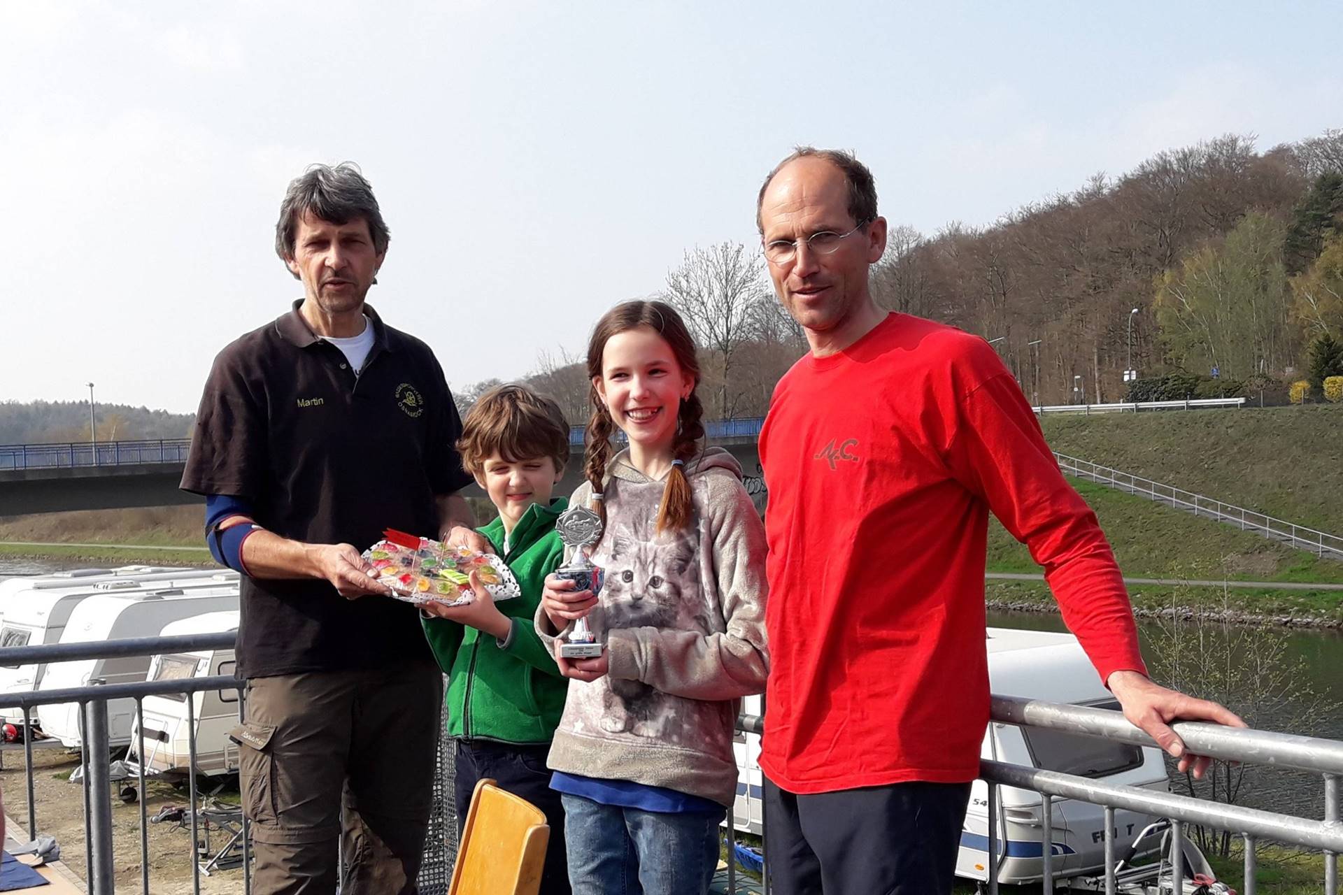 Nach dieser etwas abenteuerlichen Umtrageaktion kam nach weiteren fünf Kilometern das nächste Wehr, das umtragen werden musste. Für den etwas längeren Umtrageweg hatte der WSV Bootswagen organisiert und bot auch einen Shuttlesevice für Teilnehmer an, die hier ihre Fahrt beenden wollten. Für die, die umtragen hatten, ging es auf dem Kanal die letzten Kilometer bis zu den Bootshäusern von WSV und OKC, wo die Paddler ein umfangreiches und leckeres Angebot an Kuchen und Salaten sowie Grillgut empfing. Preise wurden auch noch verliehen. Mit 16 Teilnehmern und Thomas als Jüngstem in der Runde konnte der AKC gleich zwei Preise mit nach Albersloh nehmen (Preis für den Verein/ die Gruppe mit den meisten Teilnehmern und Preis für den jüngsten aktiven Teilnehmer).