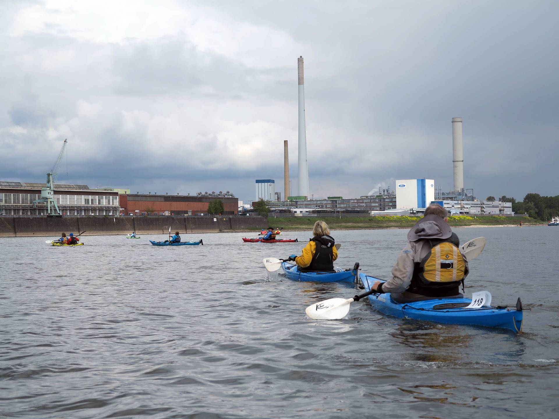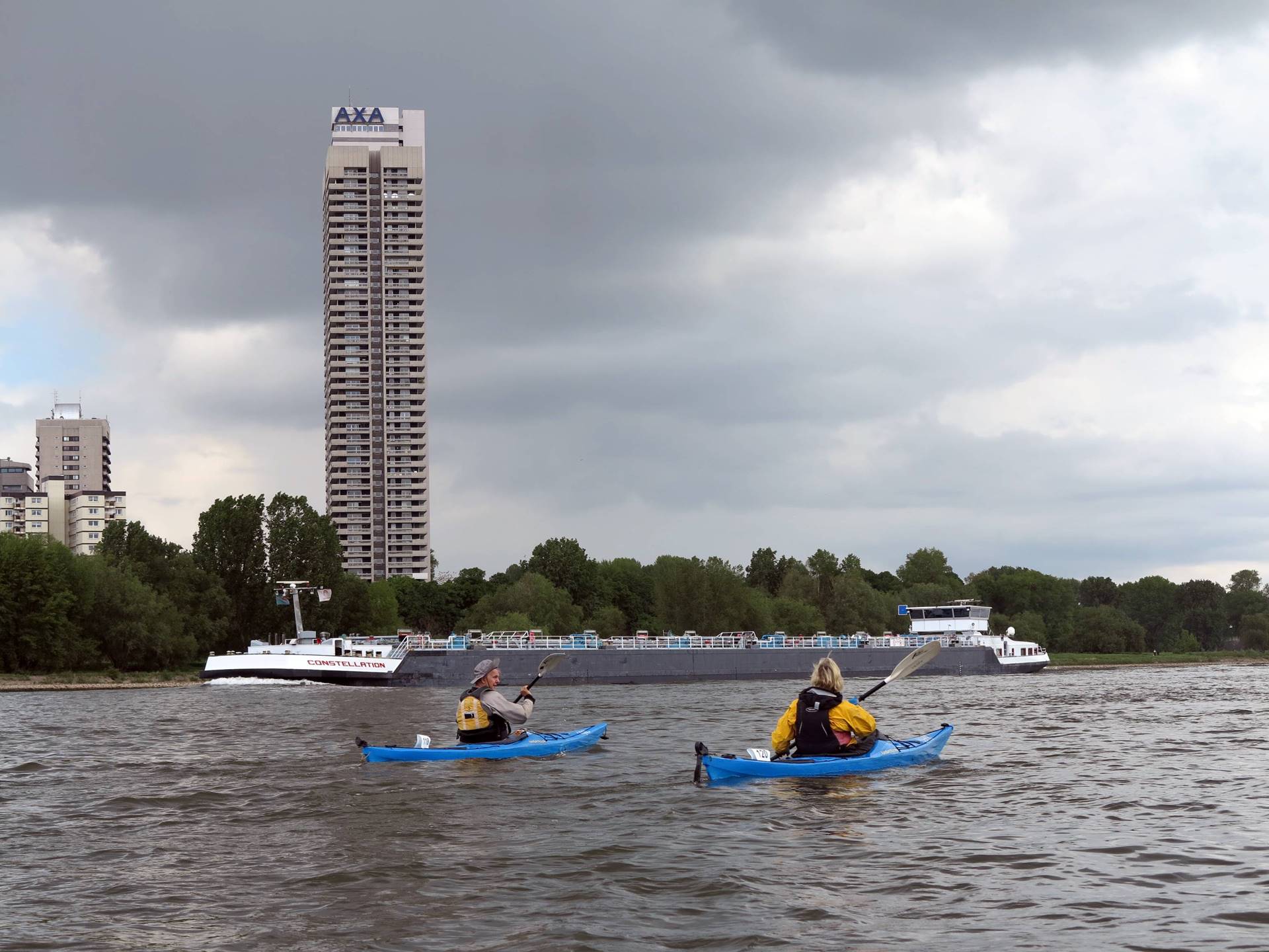 Schon bald nach dem Start erblickten die Paddler die Skyline von Köln, sicher das Highlight der Tour mit den alten Speicherhäusern neben modernen Bauten und natürlich dem Dom als Wahrzeichen der Stadt.  Der weitere Verlauf der Strecke war recht kontrastreich, mal sahen die Paddler idyllische Auen, auf denen hier und da Schafherden weideten, dann bestimmten große Industrieanlagen den Uferbereich. Ebenso kontrastreich zeigte sich das Wetter. Während anfangs noch ein dunkler wolkenverhangener Himmel nichts Gutes versprach, tröpfelte es jedoch nur ganz selten mal ein wenig und zeigte sich später sogar die Sonne.