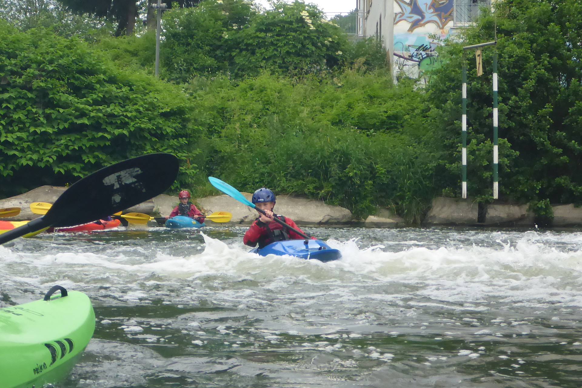 Die noch unerfahreneren Paddler hatten zunächst die Möglichkeit, noch einmal in ruhigem Wasser das Umkippen und Aussteigen aus dem gekenterten Boot zu üben. Danach wurde fleißig Kehrwasserfahren und Traversieren geübt. Die erfahreneren Paddler konnten - sofern sie nicht mit dem Anleiten oder dem Bergen von gekenterten Paddlern beschäftigt waren, und davon gab es im Laufe der Zeit doch so einige
