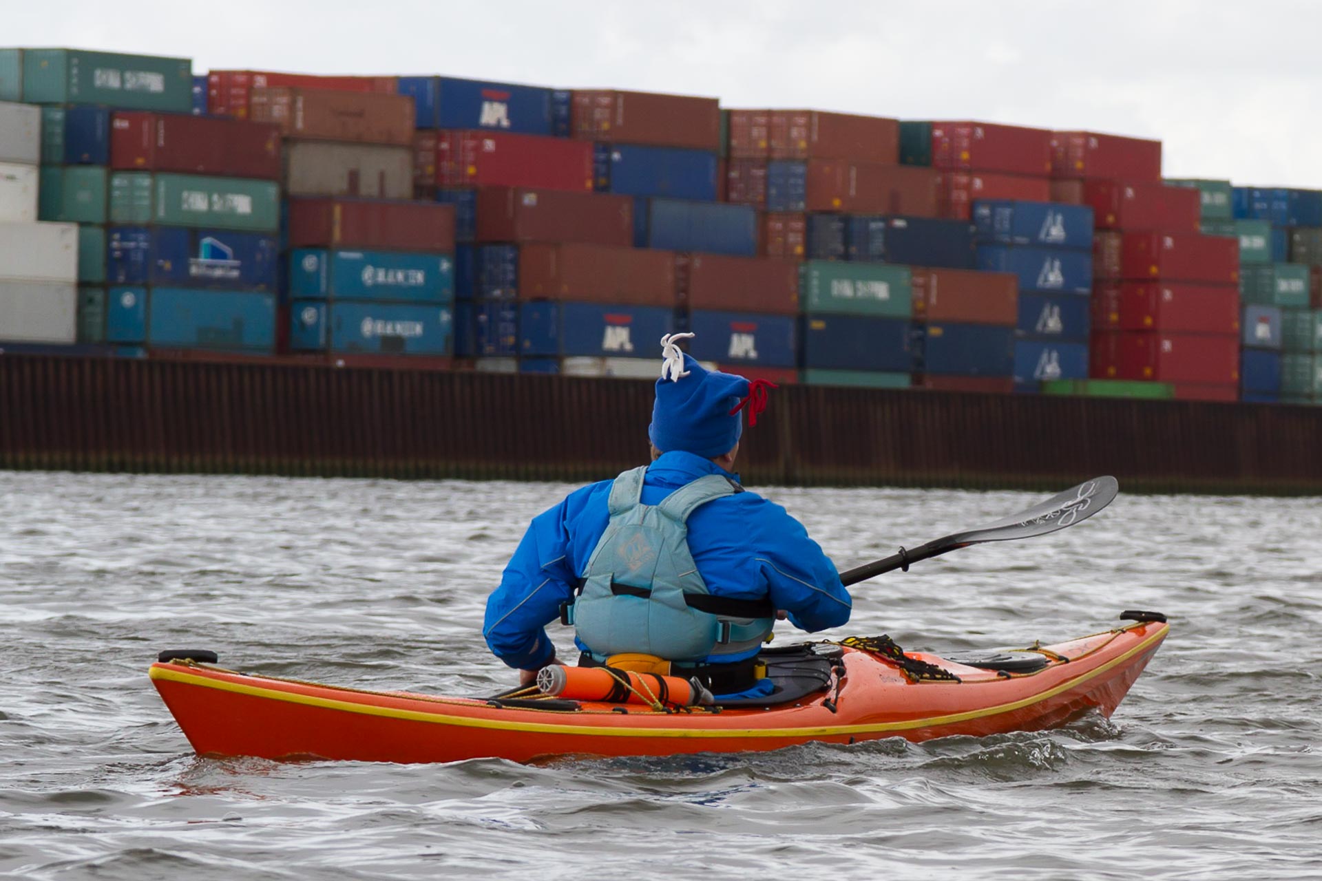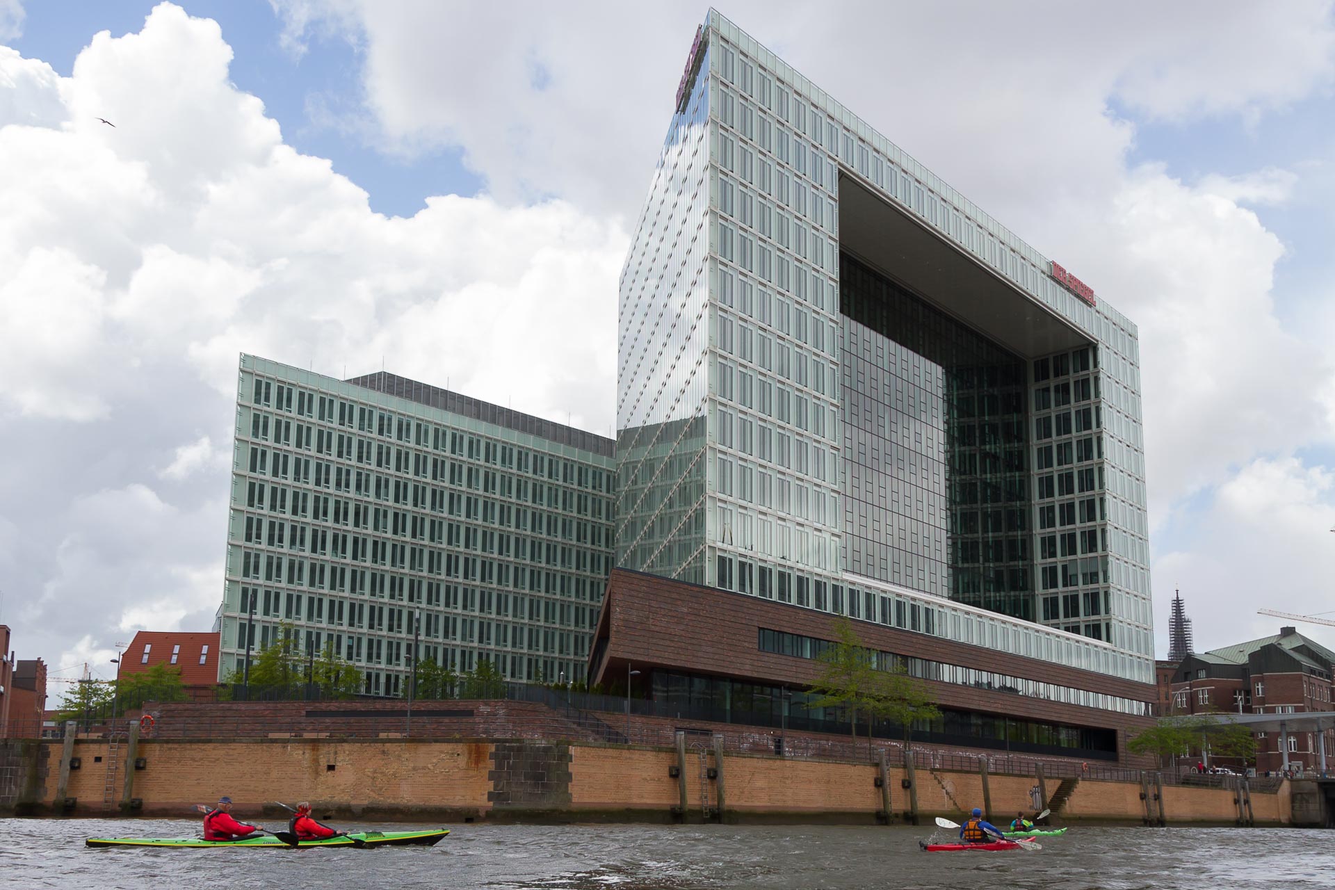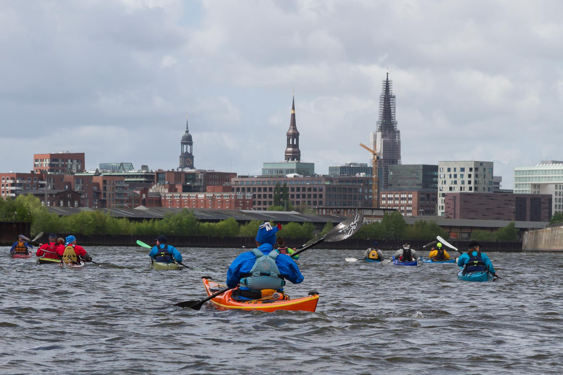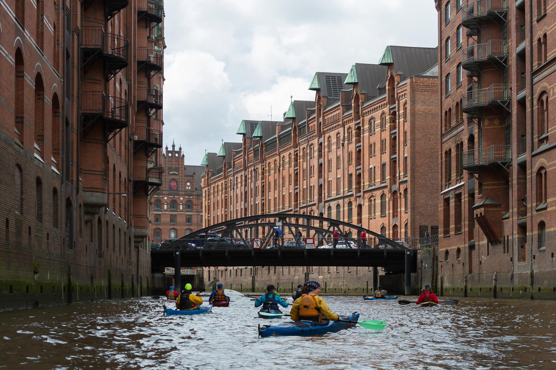 Nach dem Frühstück am Samstagmorgen wurden nocheinmal die aktuellen Wetterprognosen abgefragt: Frischer Wind mit Böen bis zu sieben Windstärken aus Nord-West. Aufgrund der Fließrichtung der Elbe hatten die Kanuten somit mit Gegenwind und Wellen zu kämpfen. Einer der Höhepunkte der Paddeltouren war am Sonntag die Fahrt durch die Innenstadt Hamburgs mit Besichtigung der Speicherstadt.