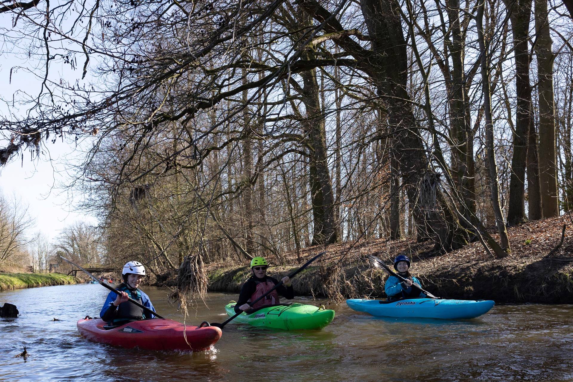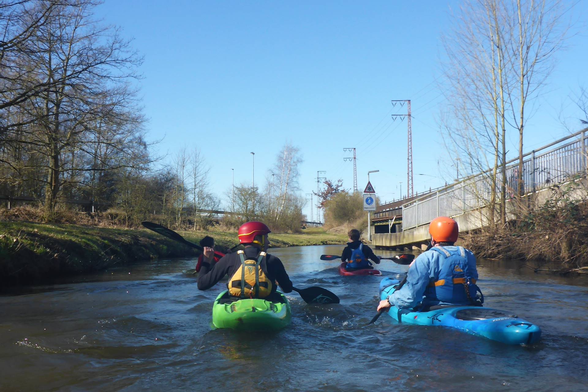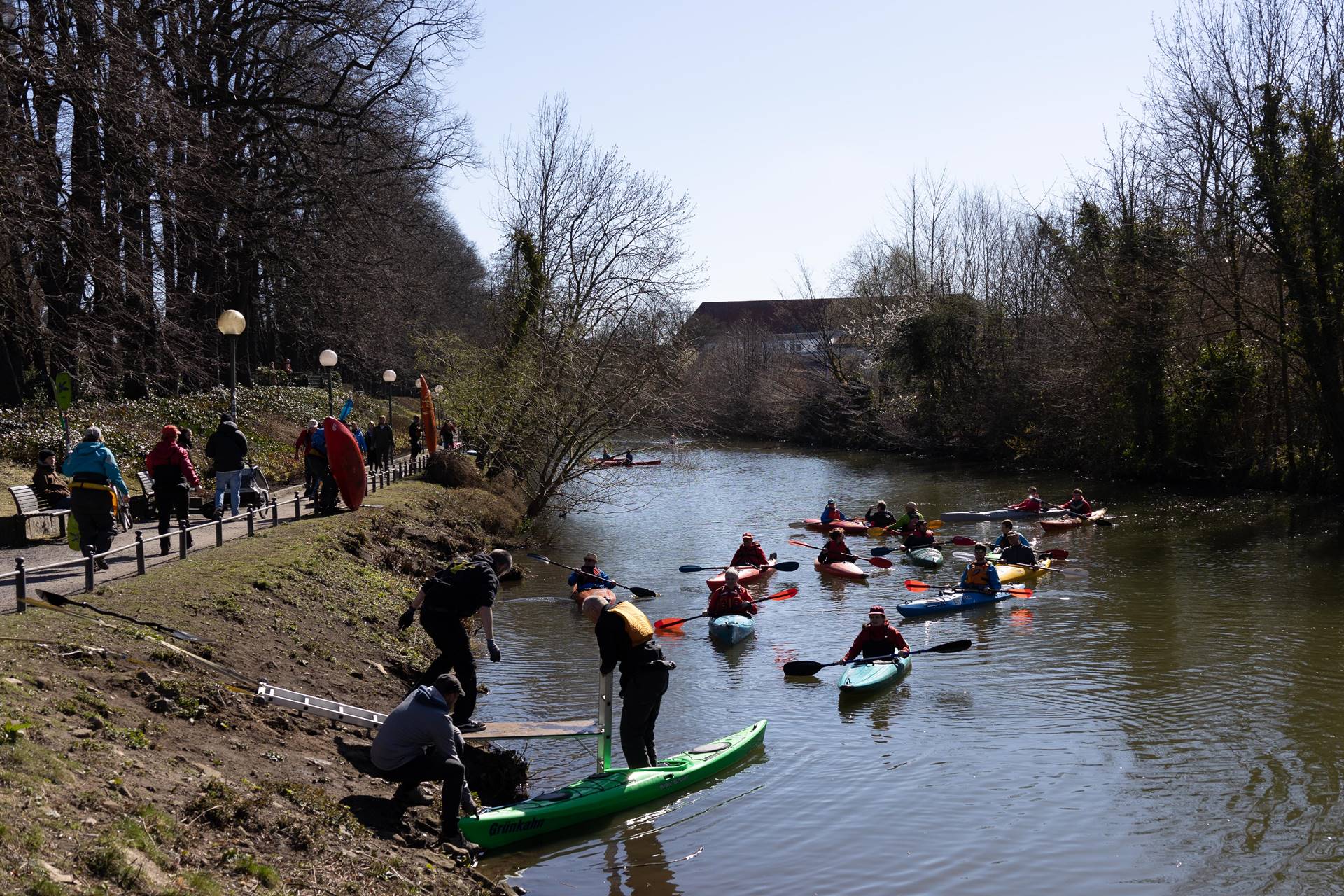 Im weiteren Verlauf musste noch ein weiteres Wehr am Kämmerer Werksgelände umtragen werden, bevor die Paddler*innen nach ca. 15km am Ausstieg waren und die Boote ein kurzes Stück durch ein Wäldchen zum Bootshaus des WSV tragen oder aber mit einem vom WSV organisierten Shuttleservice dorthin bringen lassen konnten.