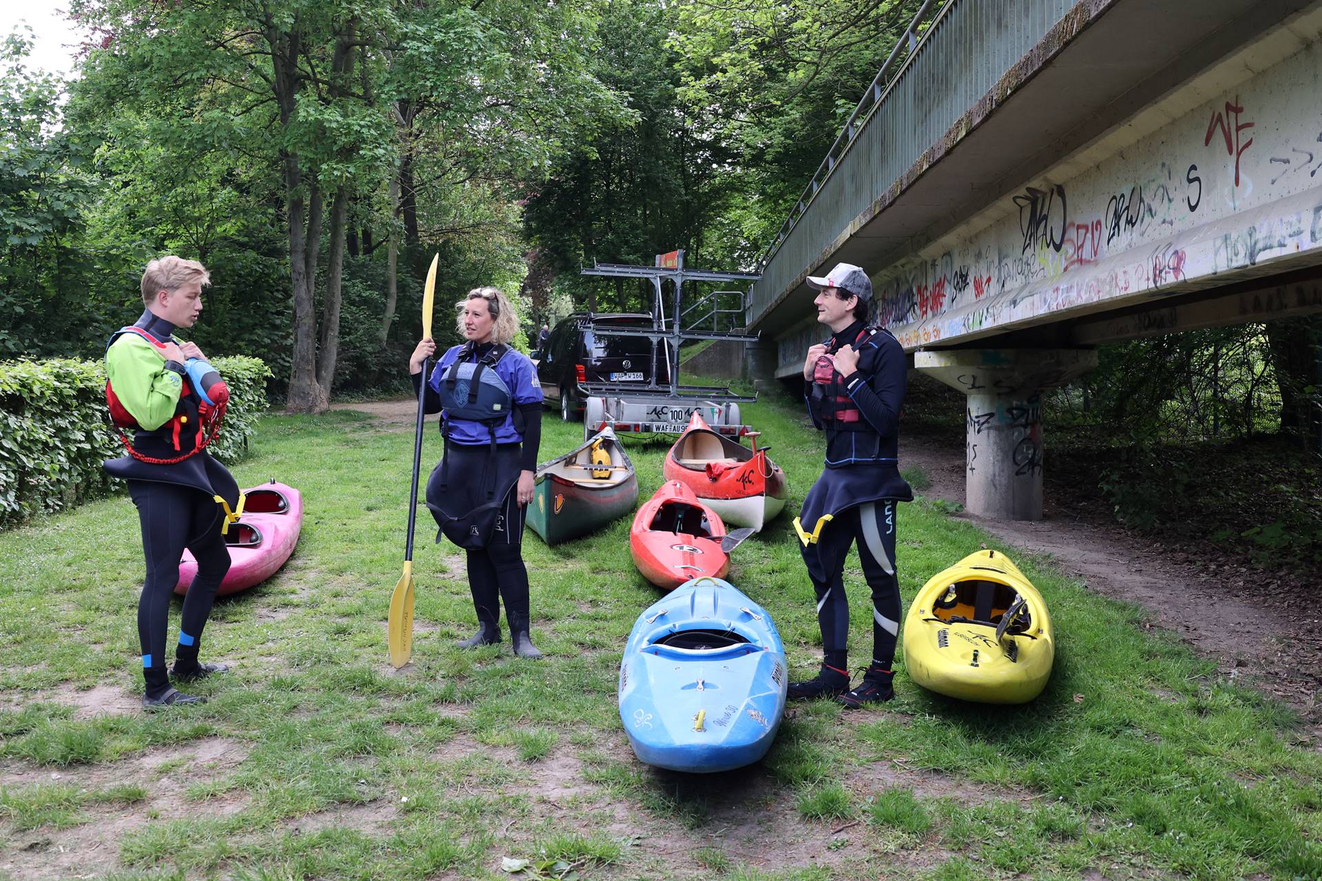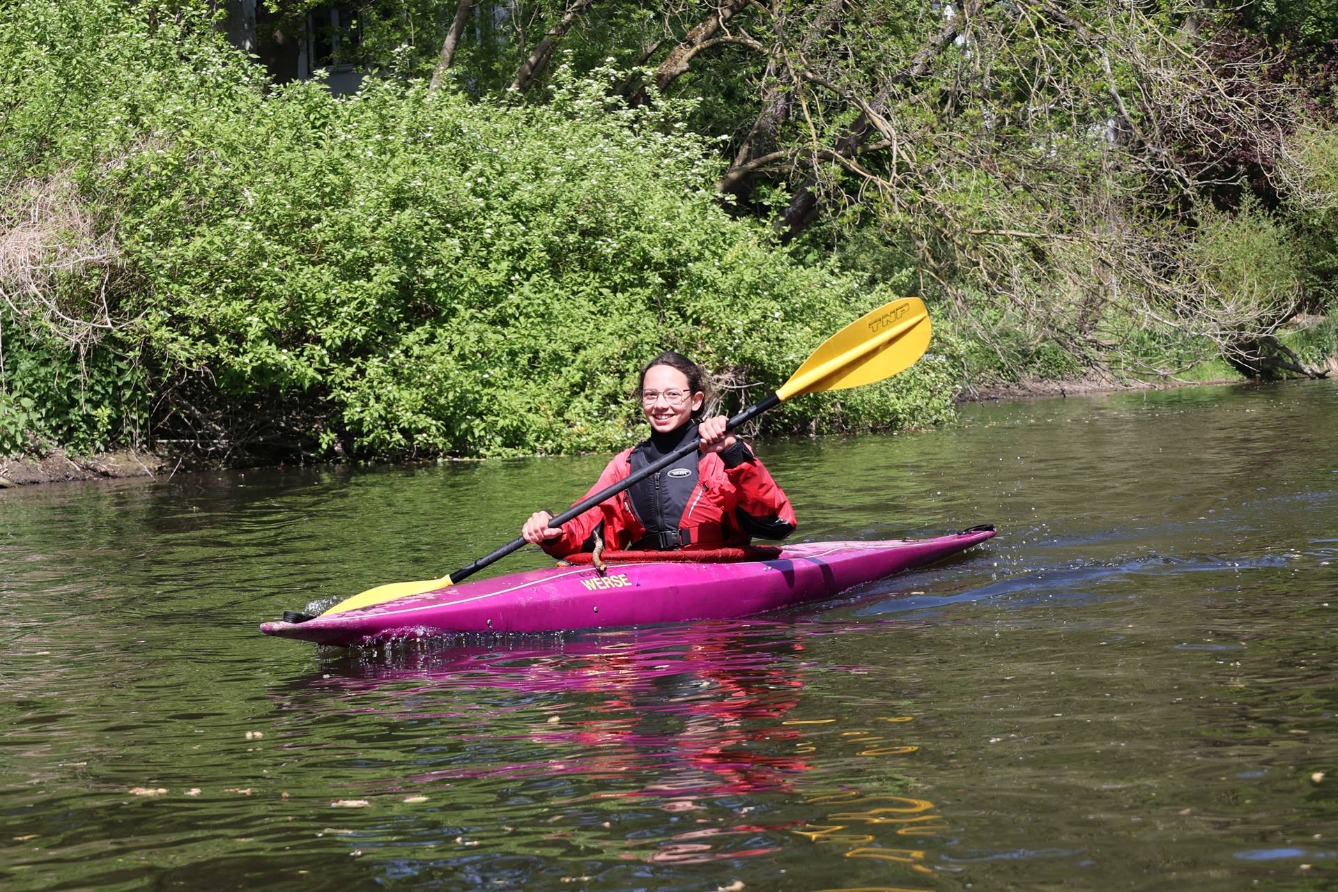 Das Jagdgebiet erstreckte sich dieses Jahr wieder auf einem Streckenabschnitt der Werse von Angelmodde bis zum Bootshaus der Turngemeinde Münster. Fuchs Sabine Kühmichel wartete geduldig in ihrem Versteck in einem Gebüsch bei einer Bank am Werseradweg, aber da auf dem Hinweg noch niemand aus der 21-köpfigen Meute den Fuchs bzw. sein an einem Baum lehnendes gelbes Paddel entdeckt hatte, musste Plan B her. Für den Rückweg der Meute platzierte sie sich besser sichtbar auf der Bank am Ufer – allerdings mit ein wenig Verkleidung in Form von Bluse, Sonnenbrille und Sonnenhut, um es der Beute nicht gar so einfach zu machen. Gefangen wurde der Fuchs schließlich von Nicolas-James Artley, der nun im nächsten Jahr – wie auch 2020 schon - Fuchs sein darf.