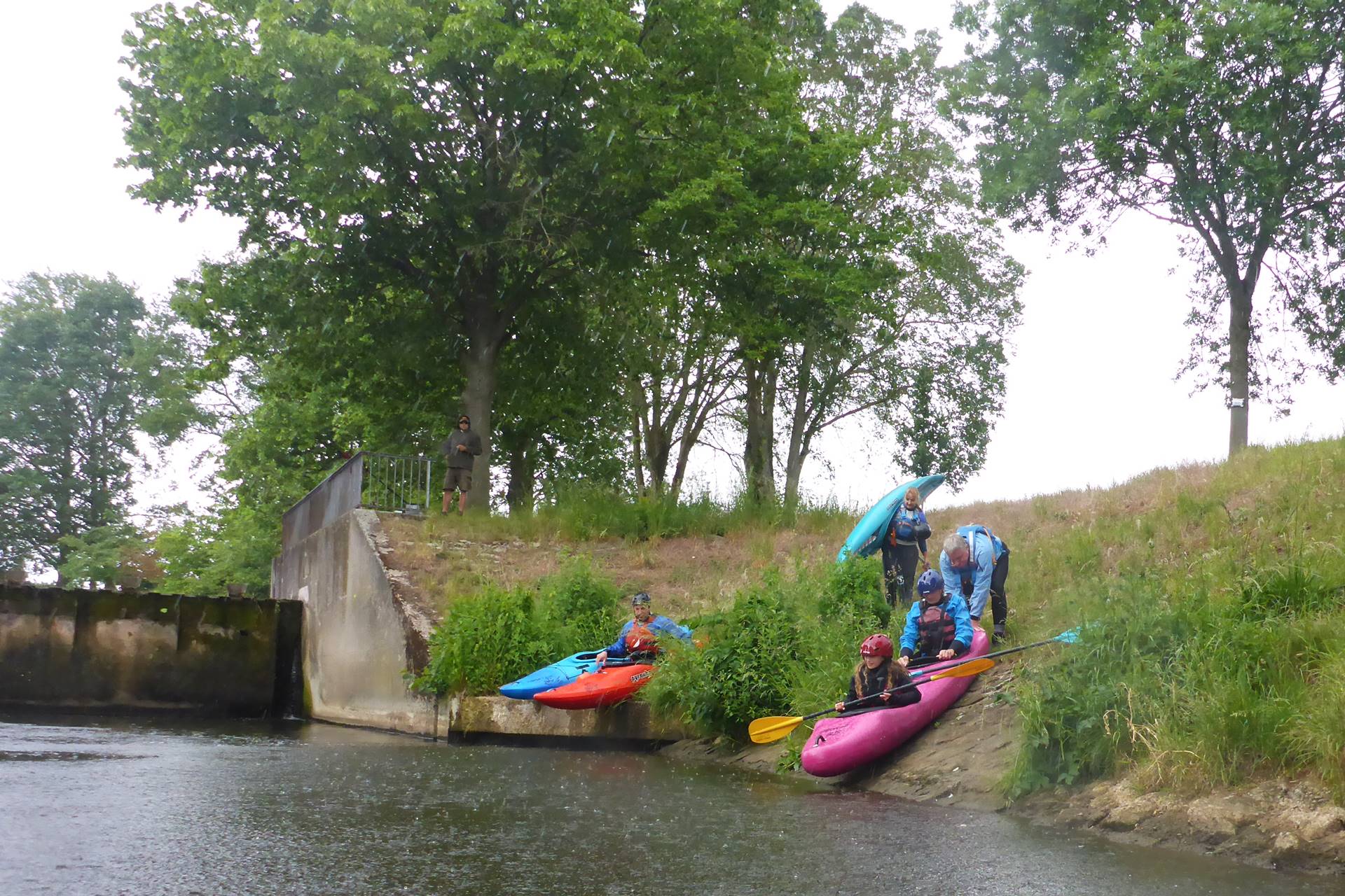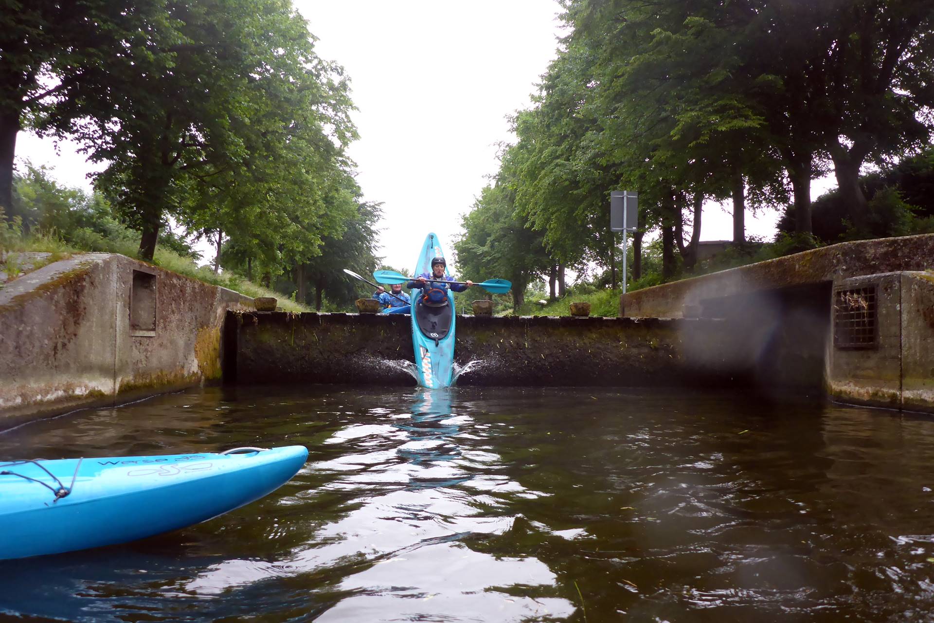 Nach dem ersten recht naturbelassenen Flussstück folgte zunächst natürlich wieder einmal ein  kleiner Abstecher auf der Vischering Stever zur Burg Vischering, wo auch diesmal ein Freiluftgottesdienst stattfand und Kirchenmusik erklang. Nach den obligatorischen Fotos ging es zurück auf den Hauptarm der Stever, um nach Umtragen des Wehrs weiter durch Lüdinghausen zu paddeln. Die beiden nächsten Wehre konnten nach Besichtigung von allen  - abgesehen vom langen Zweier - vorsichtig heruntergerutscht werden, wobei einige doch recht tief eingetunkt sind. 😉