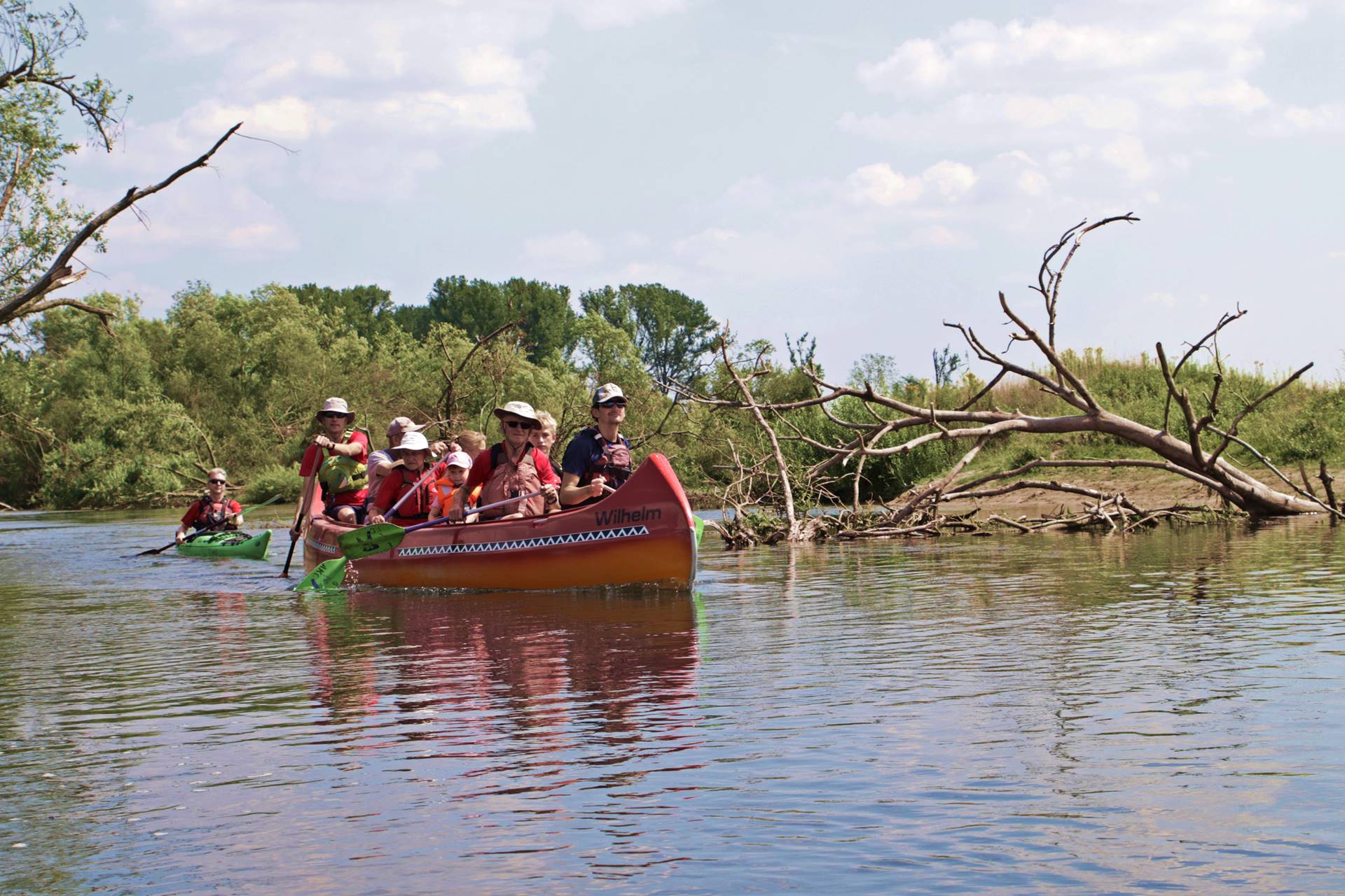 Auf der schön renaturierten Strecke waren viele Wasservögel mit ihren Jungtieren zu sehen. Allzu sehr ablenken lassen sollte man sich davon allerdings nicht, denn Canadierfahren ist schon ein wenig anders als die "normale" Sonntagstour im Kajak. Neben der anderen Sitzposition und ungewohntem Stechpaddel ist auch viel Abstimmung und Teamarbeit erforderlich, und so musste Steuermann Alexander zwischendrin dann auch nochmal daraufhinweisen, dass beide Seiten gleichzeitig mit dem Stechpaddel arbeiten müssen, damit sich das Boot nicht lustig schunkelnd übers Wasser fortbewegt. Anspruchsvoll waren auch einige enge Kurven und zahlreiche Hindernisse - Kajakfahrer aus anderen Vereinen inklusive - die mit dem dicken Canadier umschifft werden mussten. Dank unserem erfahrenen Steuermann war dies alles aber auch kein Problem.