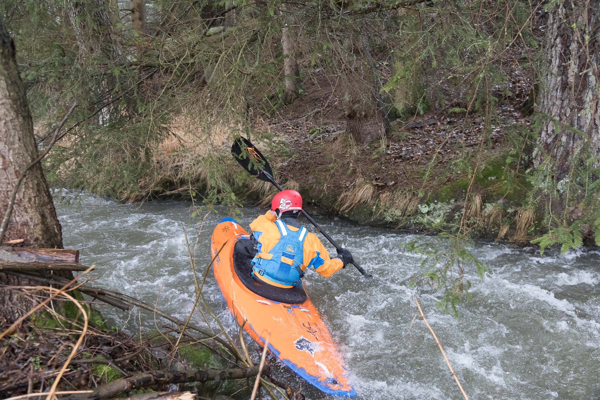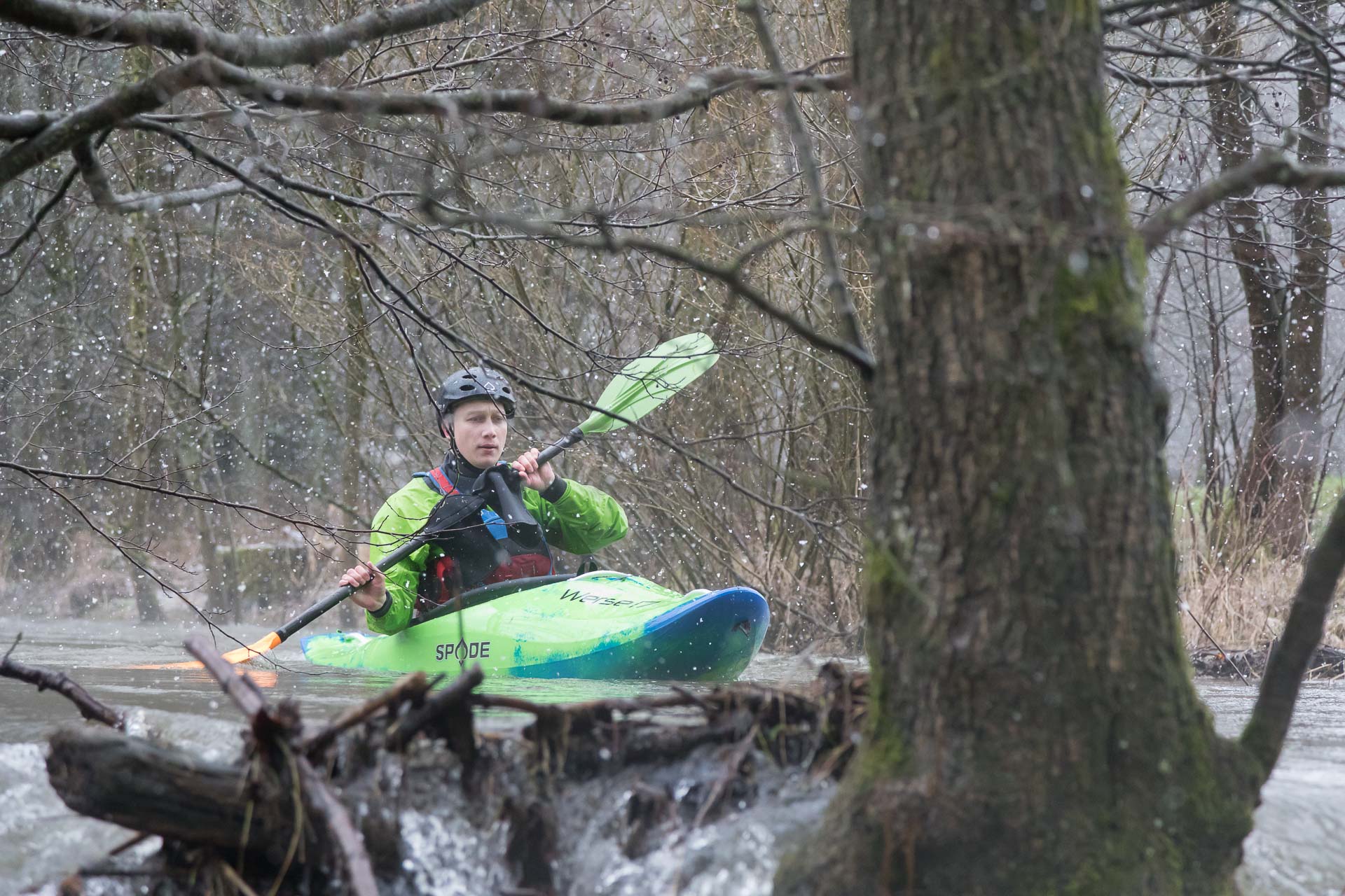 In der ersten Hälfte der 11km langen Strecke, gab es zahlreiche Baum- und Strauchhindernisse, von denen auch einige umtragen werden mussten. Bei einem Hindernis war die Strömung für einen Kanuten etwas zu stark, sodass er kenterte. Schnell war der Paddler gerette und Boot und Paddel geborgen. Die Stelle hatte es aber in sich, sodass eine weitere Kenterung mit einer Eskimorolle endete. Im weiteren Verlauf wurde die Elpe breiter und die Baumhindernisse nahmen ab.