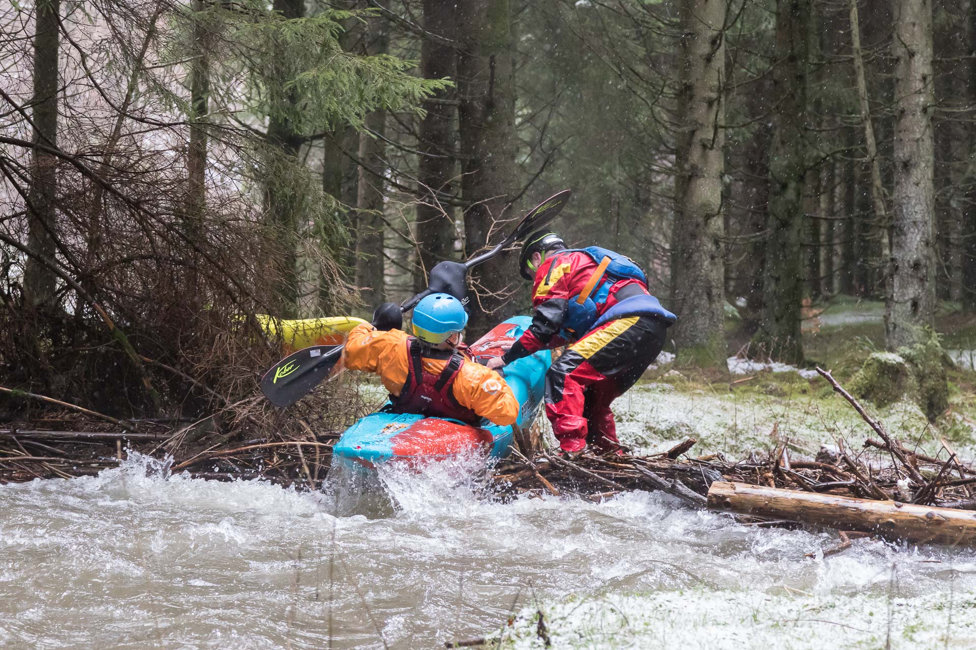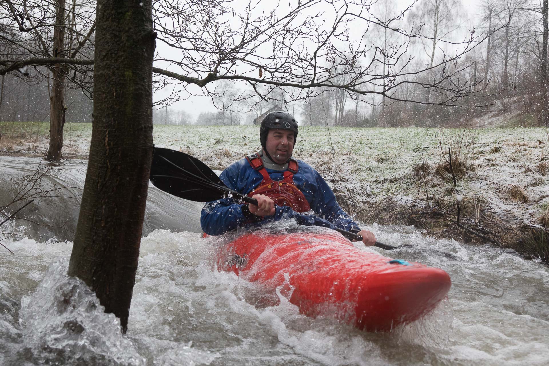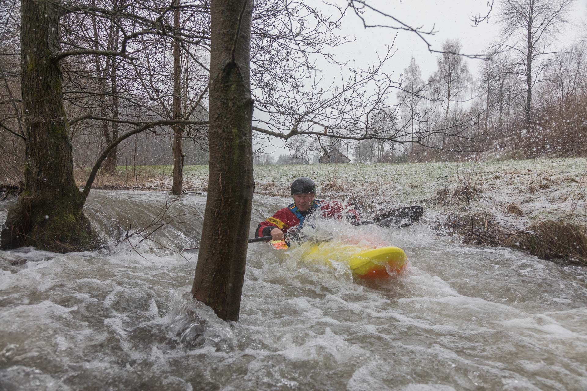 Nach dem die sechs Albersloher Kanuten sich mit Paddlern des befreundeten KC Fröndenberg in Unna getroffen hatten, wurde der Einstieg am Sportplatz in der Ortschaft Elpe angefahren. Auf der Autofahrt sank die Temperatur von 6° in Albersloh auf 1,5° am Einstieg. Der Regen war in Schnee übergegangen. Glücklicherweise gab es beim SUS Elpe einen Unterstand, in dem sich die Kanuten trocken umziehen und darauf warten konnten, bis die Autos zur Ausstiegsstelle in Bestwig gebracht worden waren.