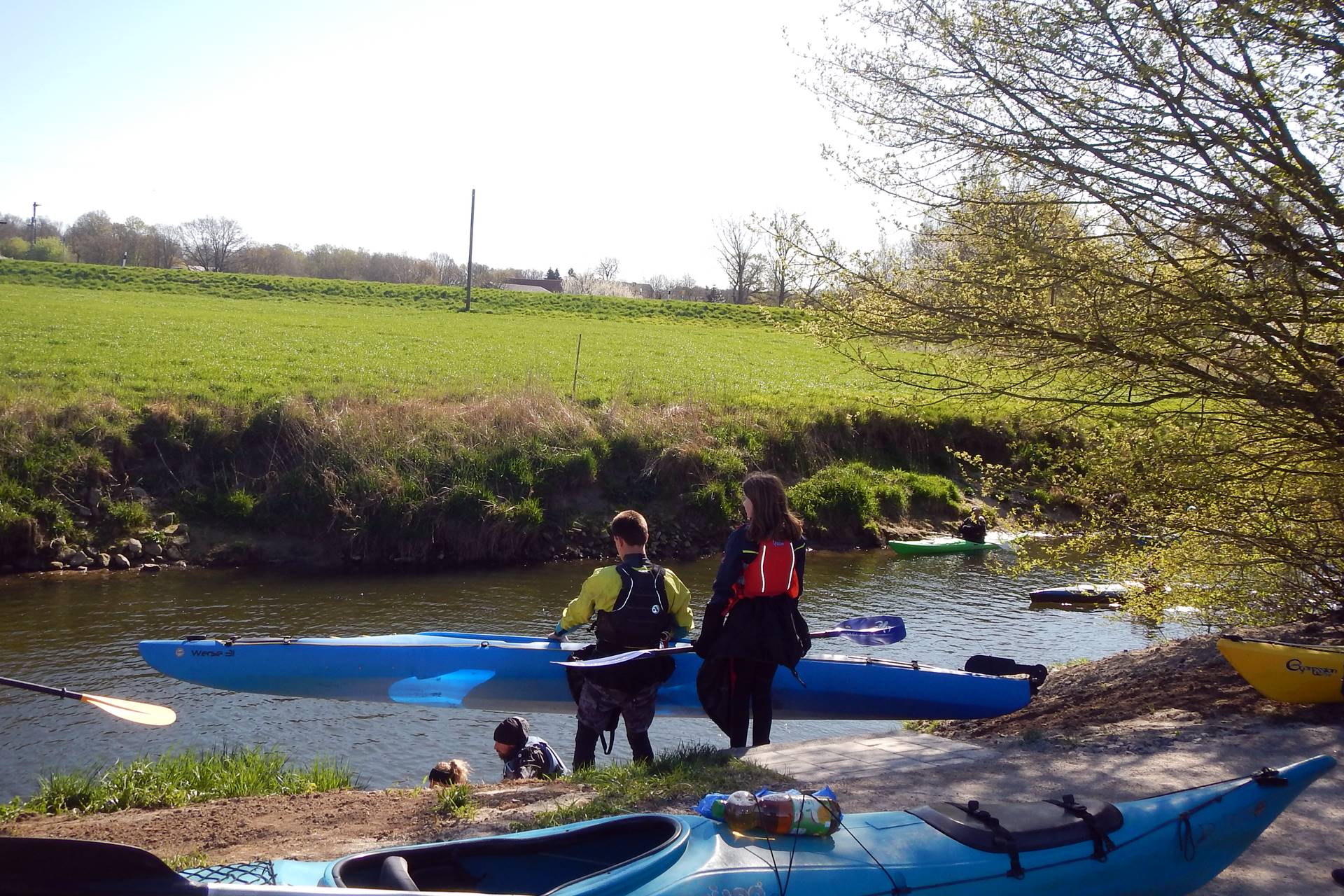 Nach gemeinsamem Start, hieß es nach wenigen Kilometern am Blockwurfwehr erst einmal wieder aus den Booten zu steigen, um das erste Wehr zu umtragen. Bis auf wenige Ausnahmen, die das Wehr bei niedrigem Wasserstand im Zickzack vorsichtig durchfuhren, stand für die meisten also Booteschleppen und nach dem Wehr wieder einsetzen an, wobei die Aus- und Einsatzstellen hier leider nicht sehr komfortabel sind, aber mit gegenseitiger Hilfe kamen doch alle wieder gut auf den Fluss. Lediglich ein Teilnehmer war etwas zu ungeduldig und machte beim Aussteigen am steilen Ufer unfreiwillig Bekanntschaft mit dem doch noch recht kalten Wersewasser.