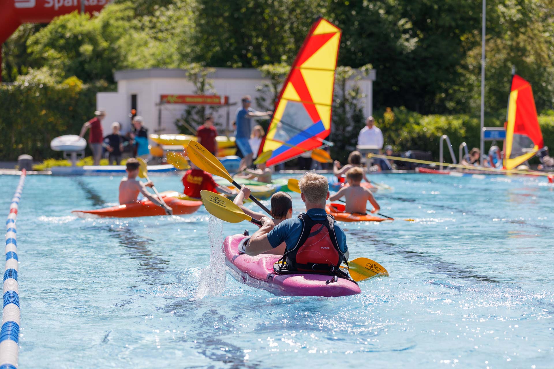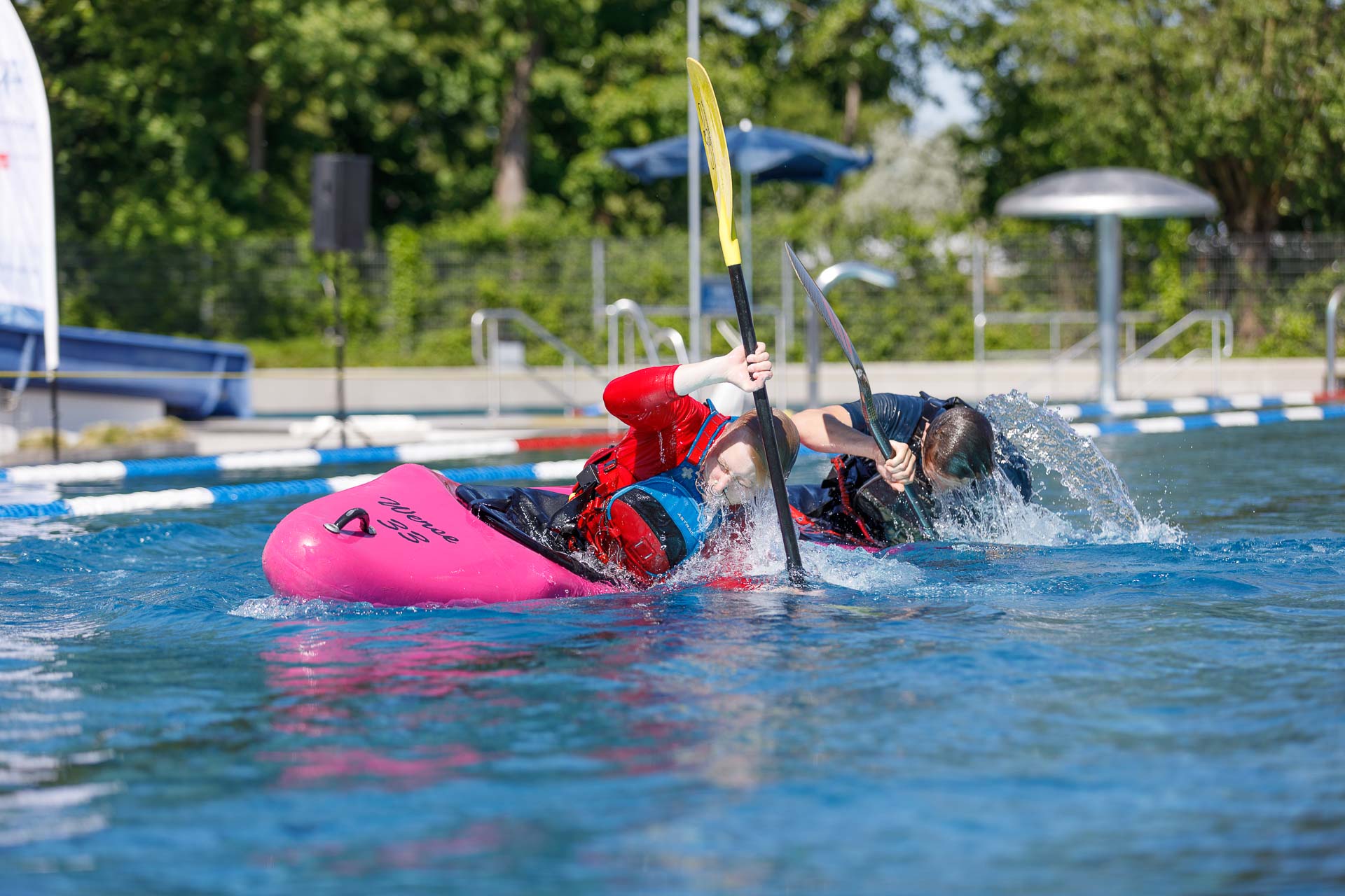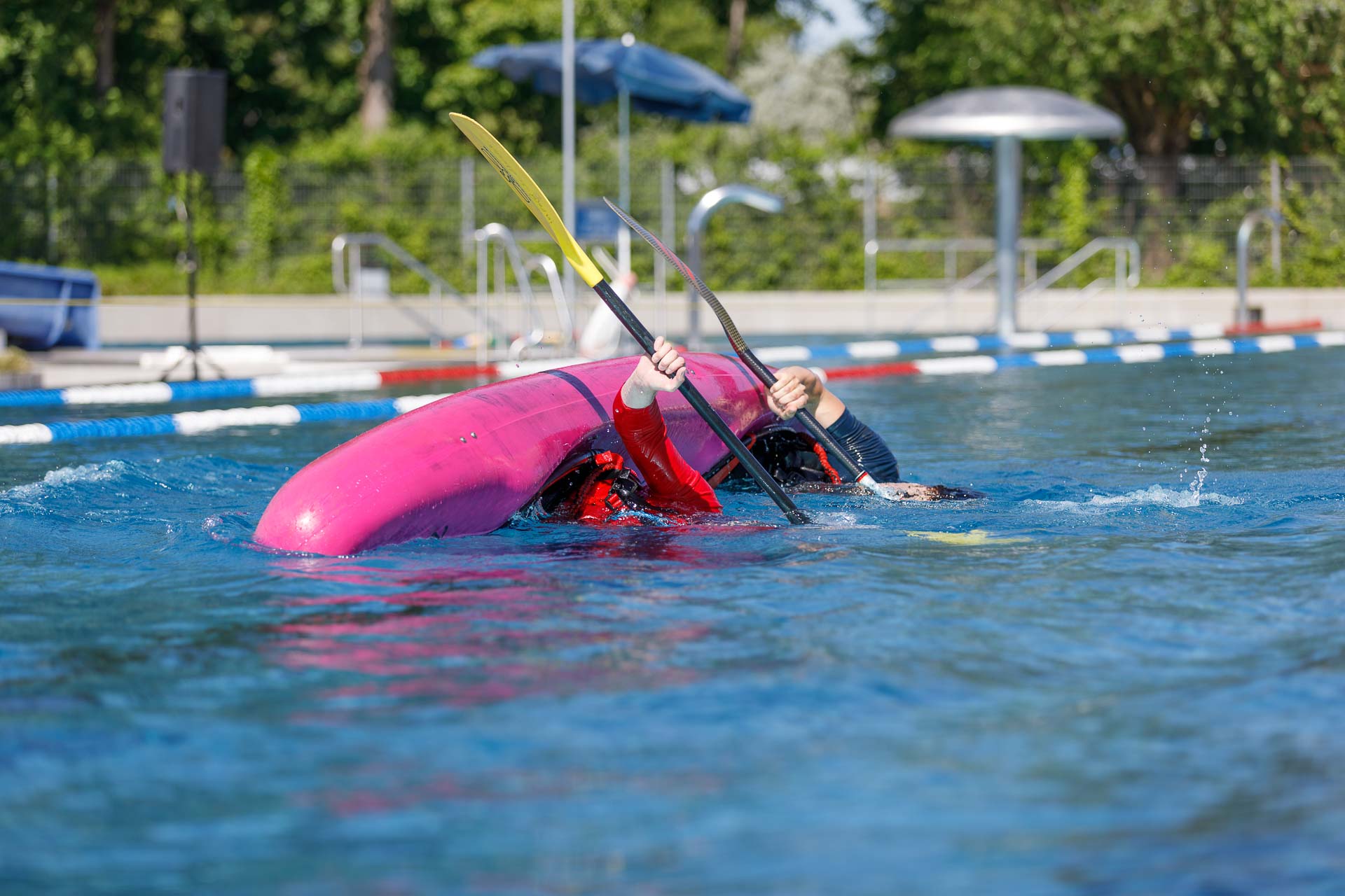 Mit kurzen kommentierten Vorführungen haben wir Einblicke in den Kanusport gegeben. Im ersten Block Paddeltechnik von den Basics zu Freestyle, haben wir den Unterschied zwischen Kajak, Canadier und Kanu als Oberbegriff erläutert und grundlegende Paddeltechniken wie den Grundschlag Vorwärts oder die Paddelstütze demonstriert. Weiter ging es mit dem Verhalten nach einer Kenterung bis hin zu Kajakfreestyle mit Kerze und Cartwheel.