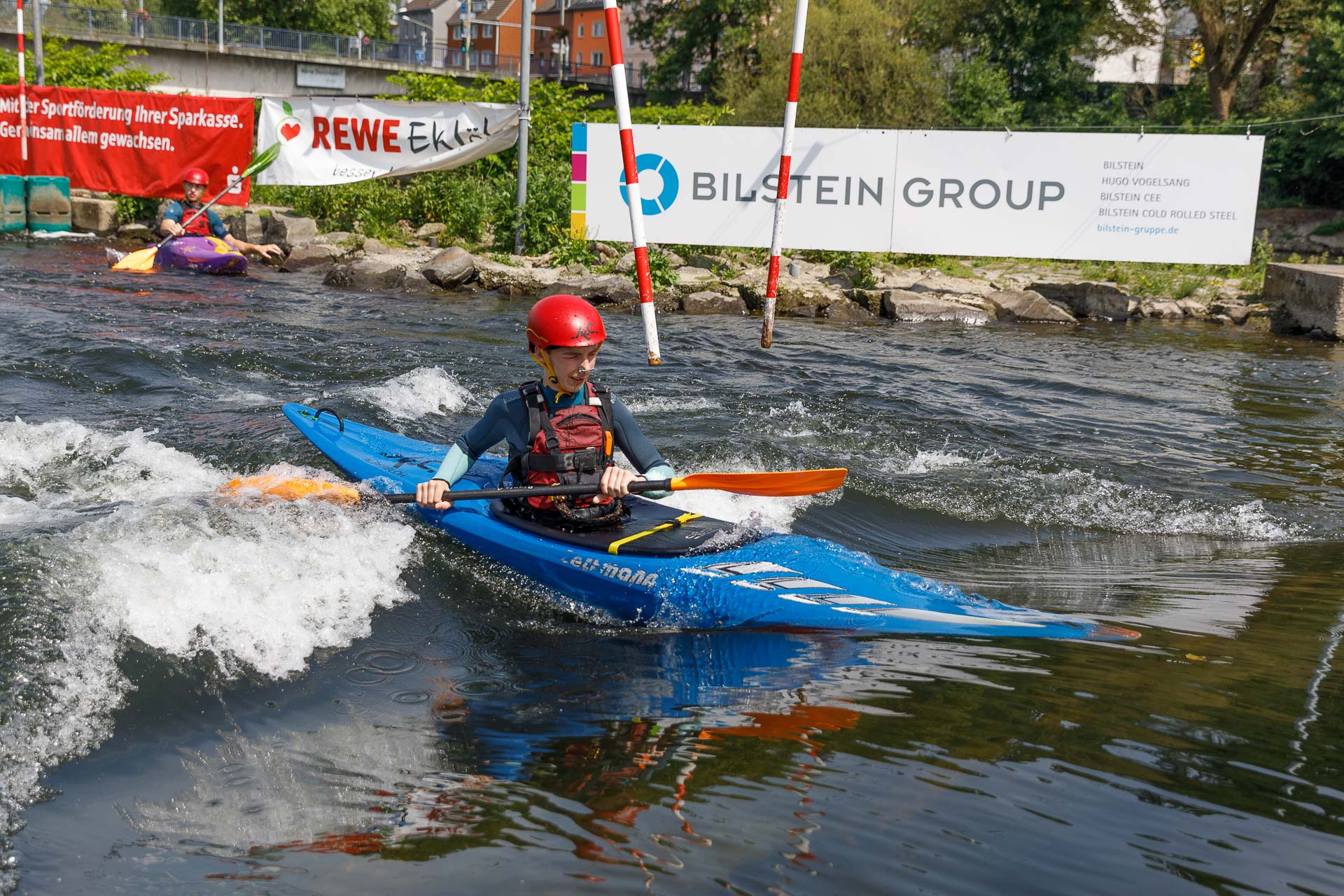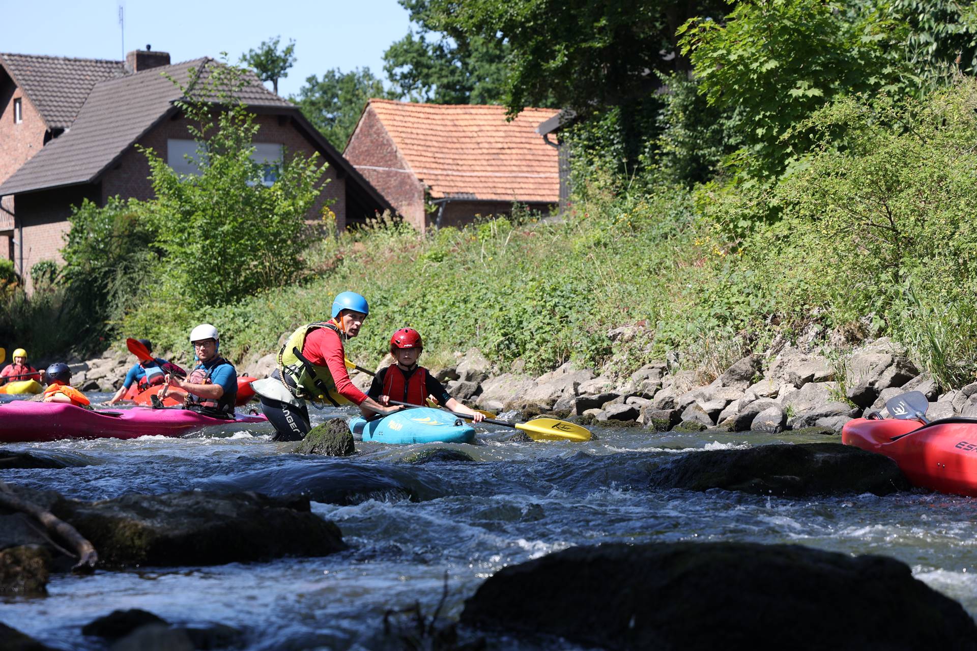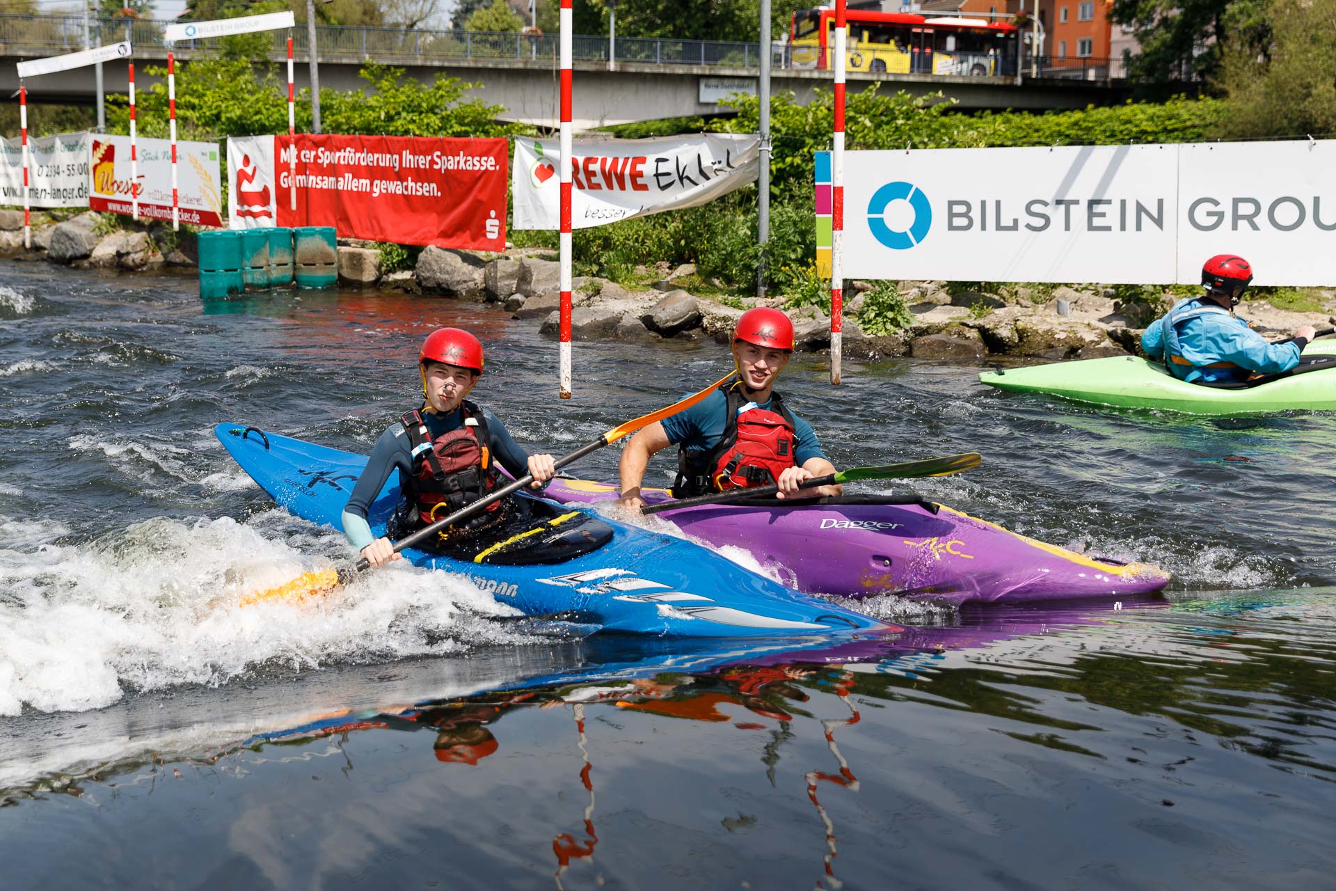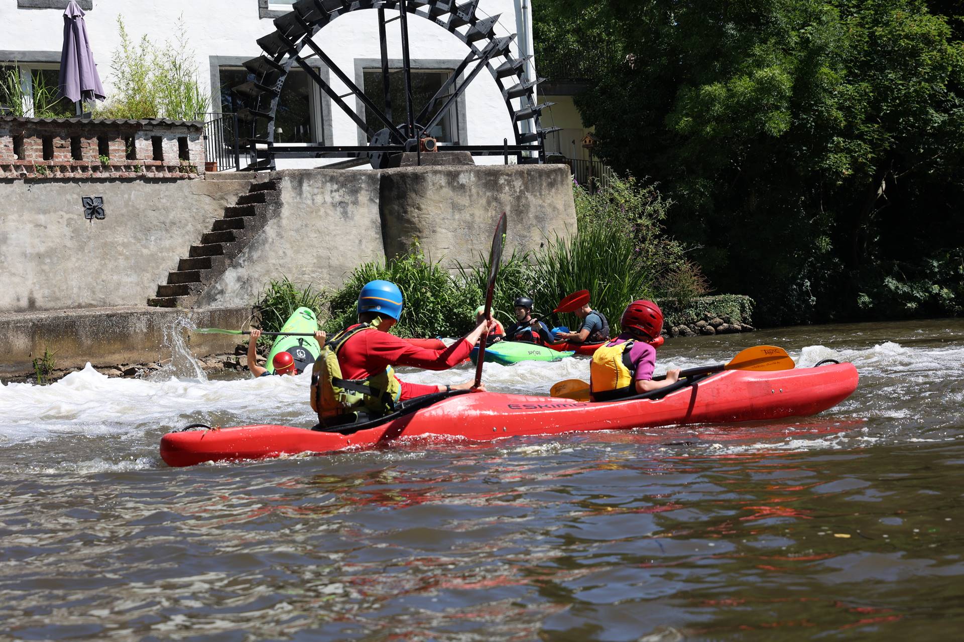 Die Boote waren schon Freitag nach dem Training geladen worden und so konnte es kurz nach dem Treffen um 9.00 Uhr gleich los nach Hohenlimburg gehen. Dort angekommen, wurden die Kajaks abgeladen, Eintrittsbändchen gekauft, sich umgezogen und schon konnte es losgehen. Einige gingen dann direkt aufs Wasser, andere liefen erst einmal die Strecke ab und ließen sich von Alex und Linus die Besonderheiten und besten Fahrtechniken bei den einzelnen Stellen erklären.