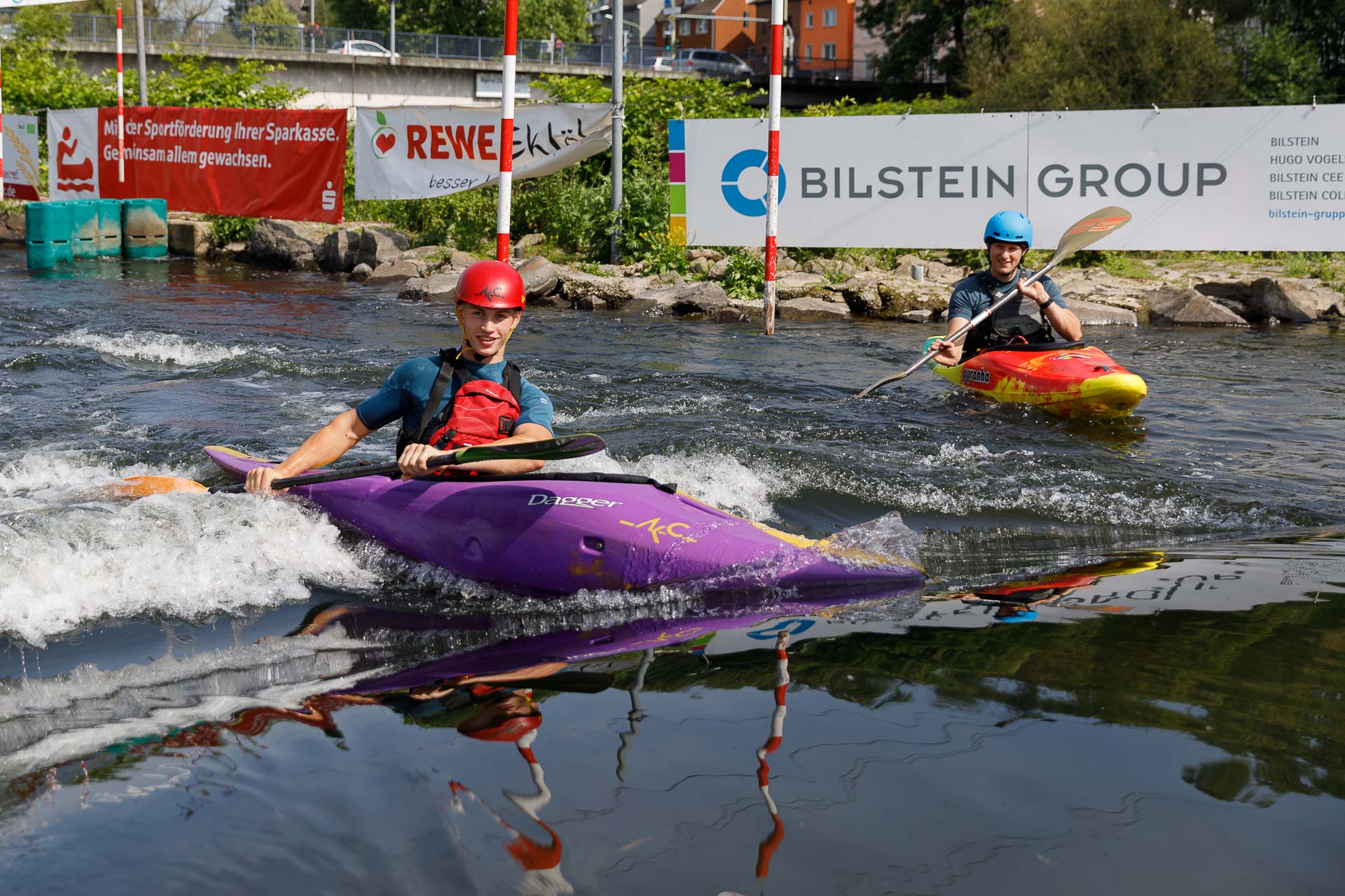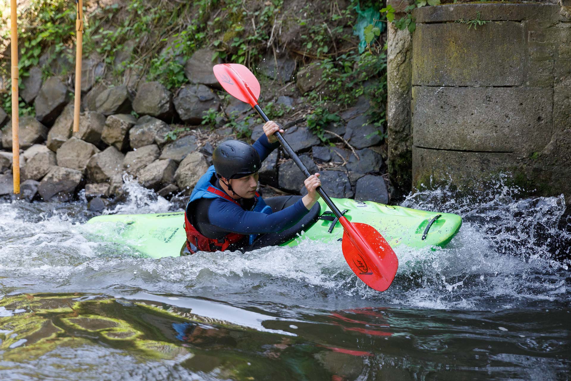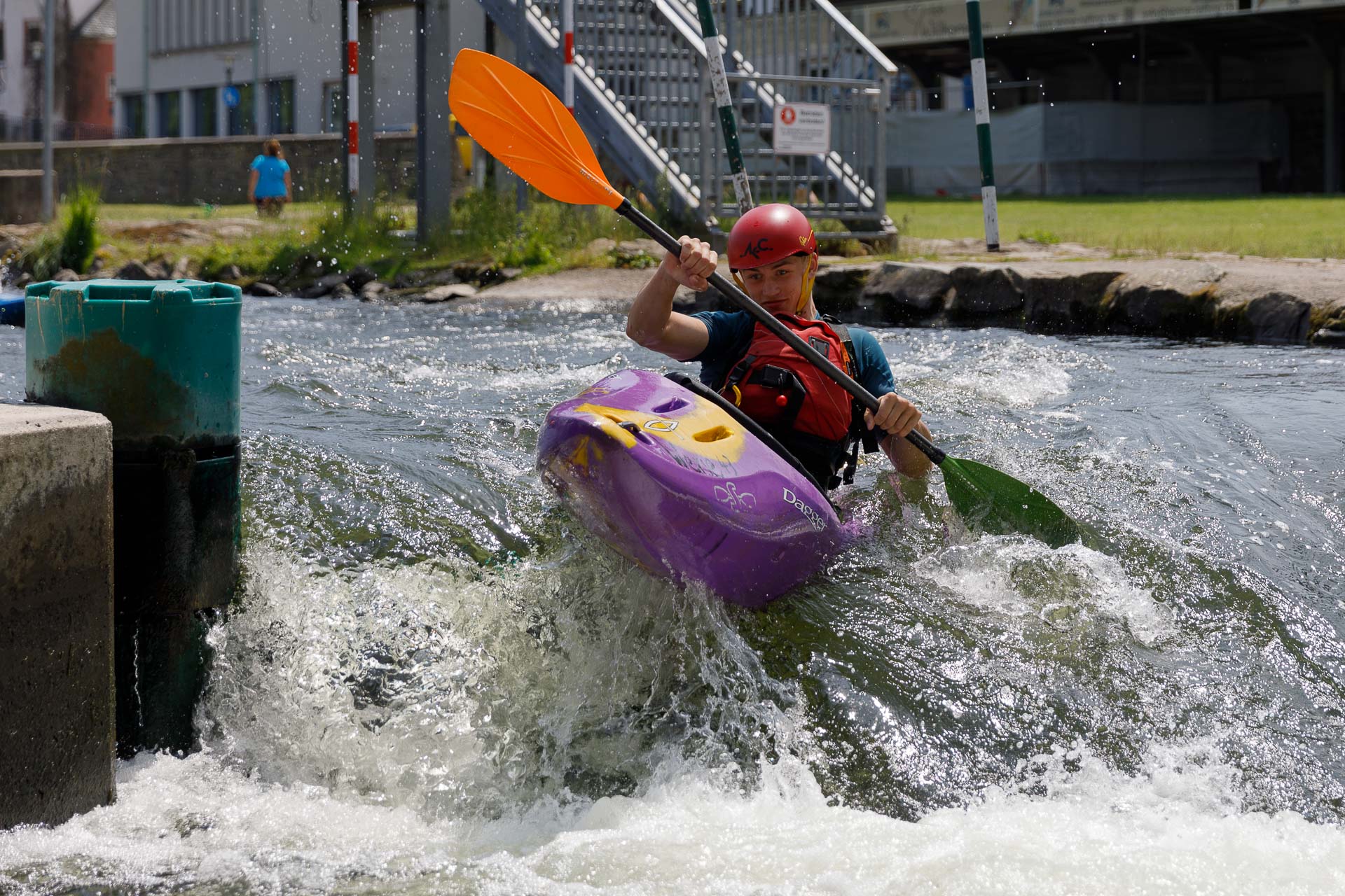 Die Boote waren schon Freitag nach dem Training geladen worden und so konnte es kurz nach dem Treffen um 9.00 Uhr gleich los nach Hohenlimburg gehen. Dort angekommen, wurden die Kajaks abgeladen, Eintrittsbändchen gekauft, sich umgezogen und schon konnte es losgehen. Einige gingen dann direkt aufs Wasser, andere liefen erst einmal die Strecke ab und ließen sich von Alex und Linus die Besonderheiten und besten Fahrtechniken bei den einzelnen Stellen erklären.