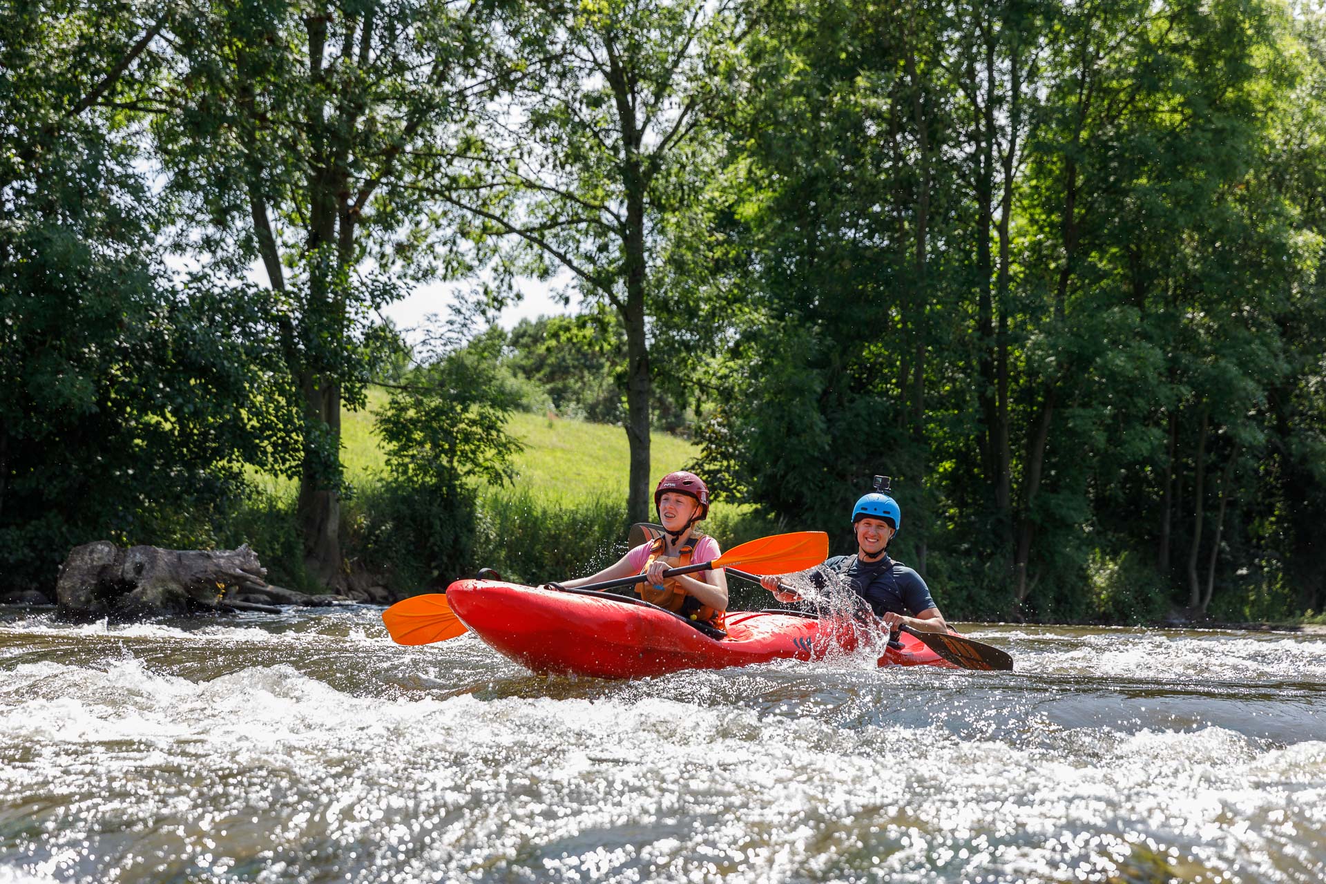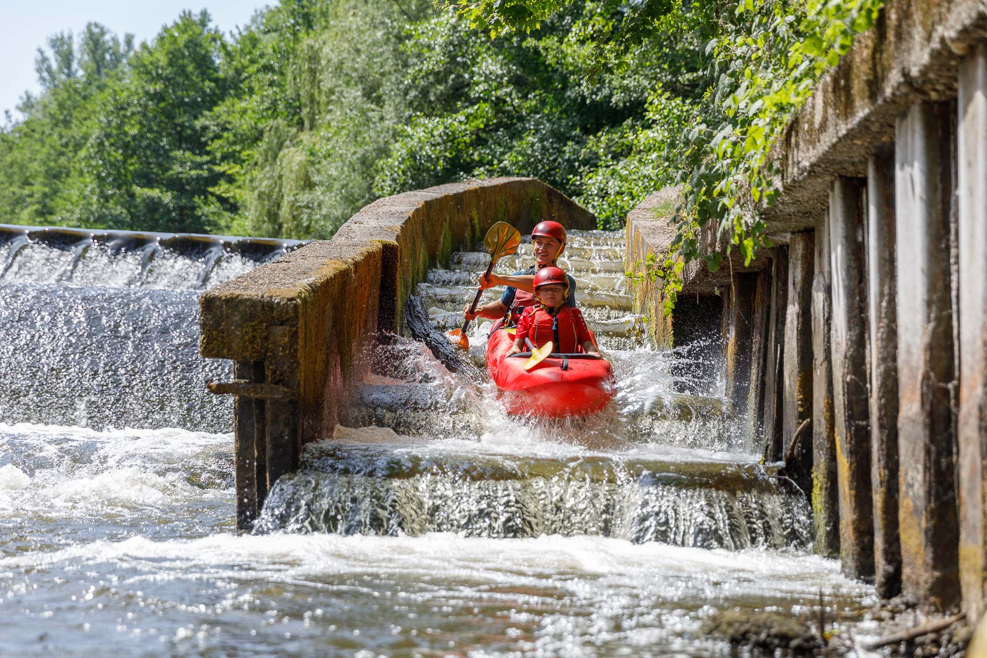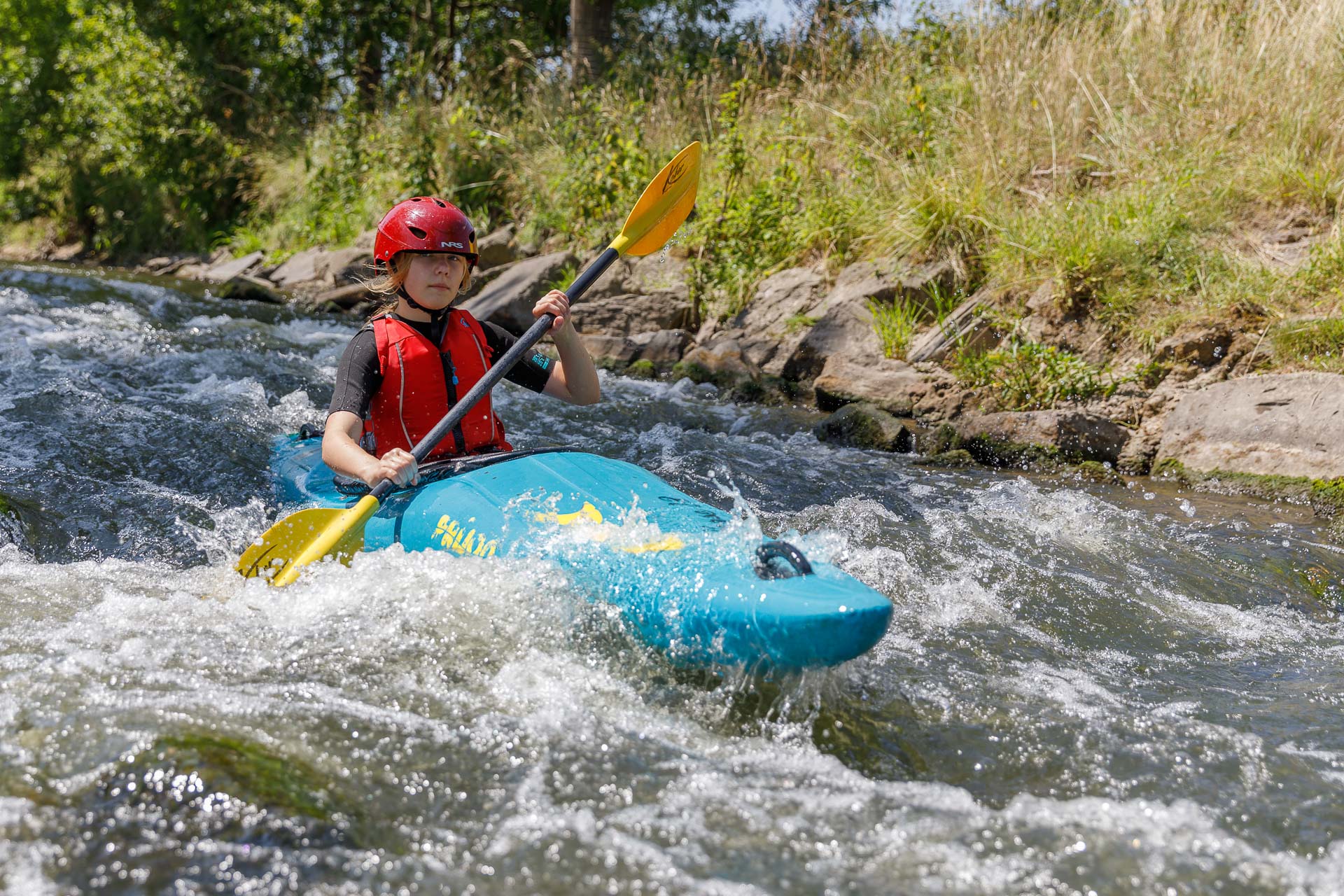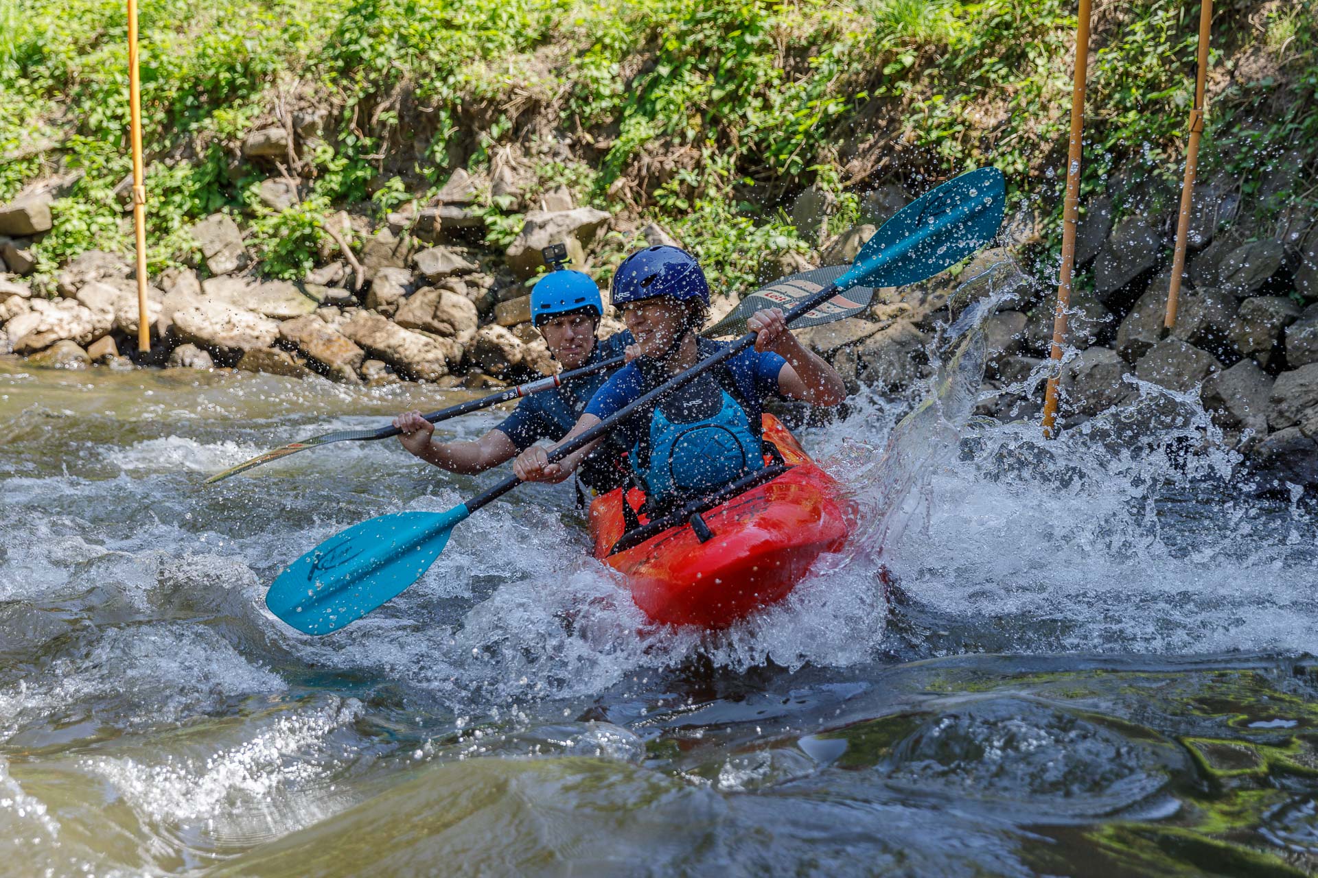 Die Boote waren schon Freitag nach dem Training geladen worden und so konnte es kurz nach dem Treffen um 9.00 Uhr gleich los nach Hohenlimburg gehen. Dort angekommen, wurden die Kajaks abgeladen, Eintrittsbändchen gekauft, sich umgezogen und schon konnte es losgehen. Einige gingen dann direkt aufs Wasser, andere liefen erst einmal die Strecke ab und ließen sich von Alex und Linus die Besonderheiten und besten Fahrtechniken bei den einzelnen Stellen erklären.