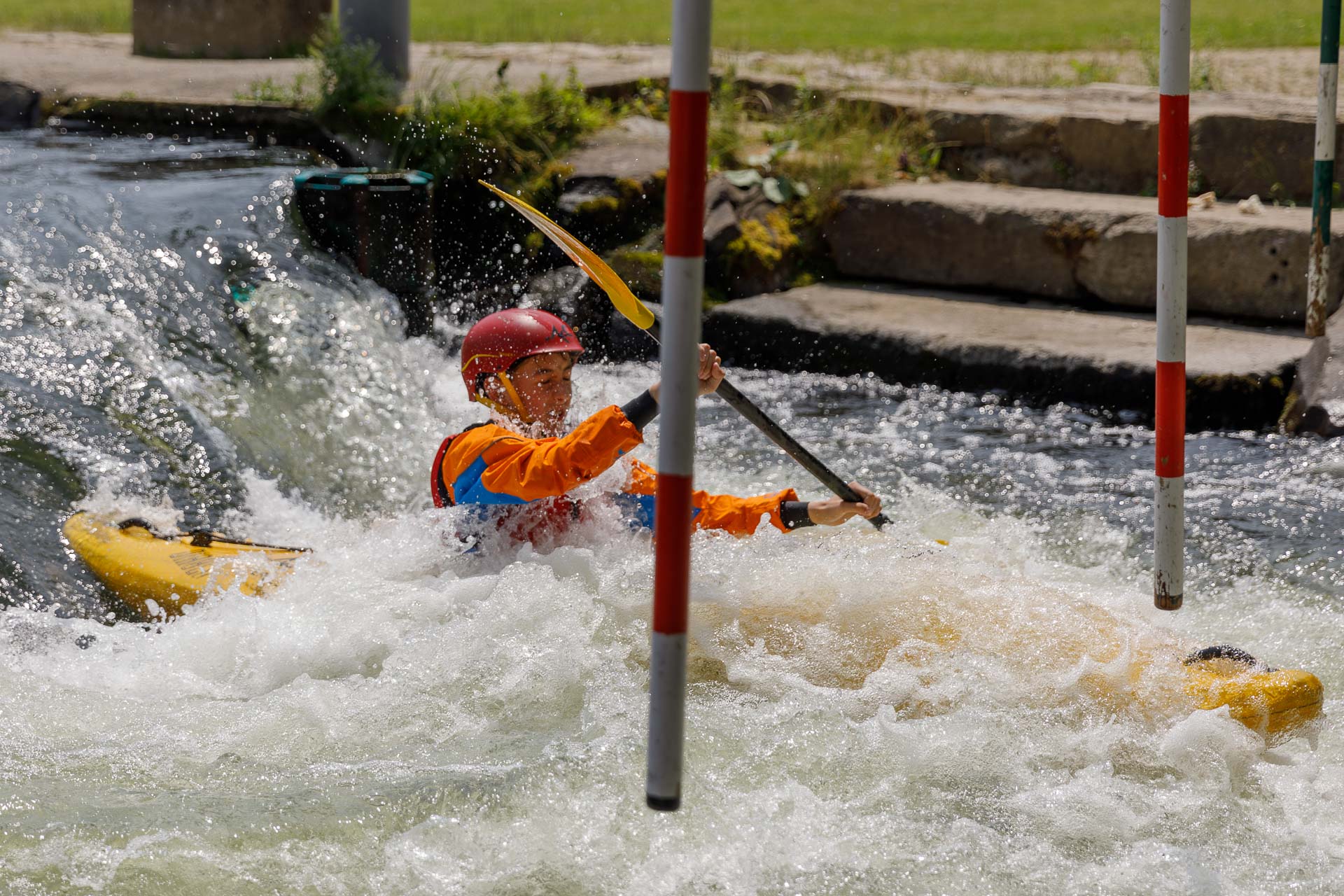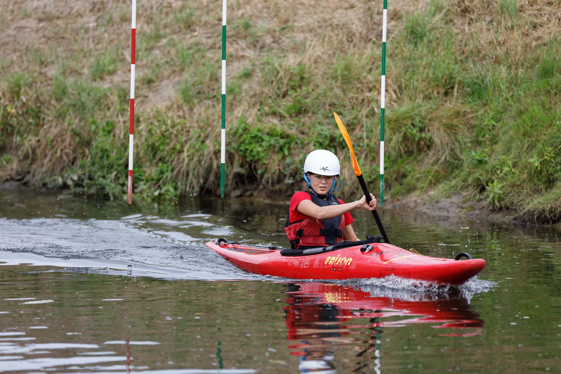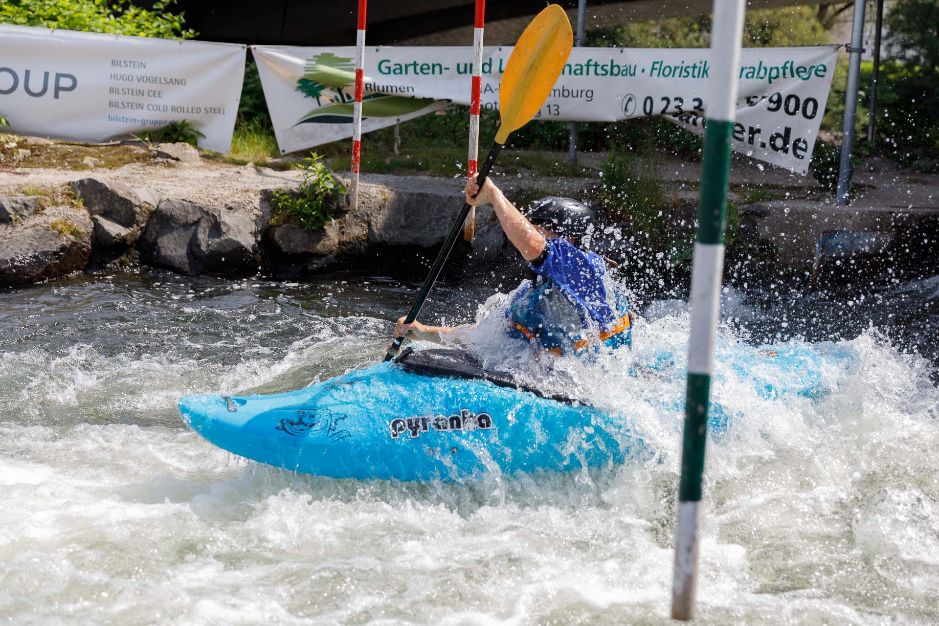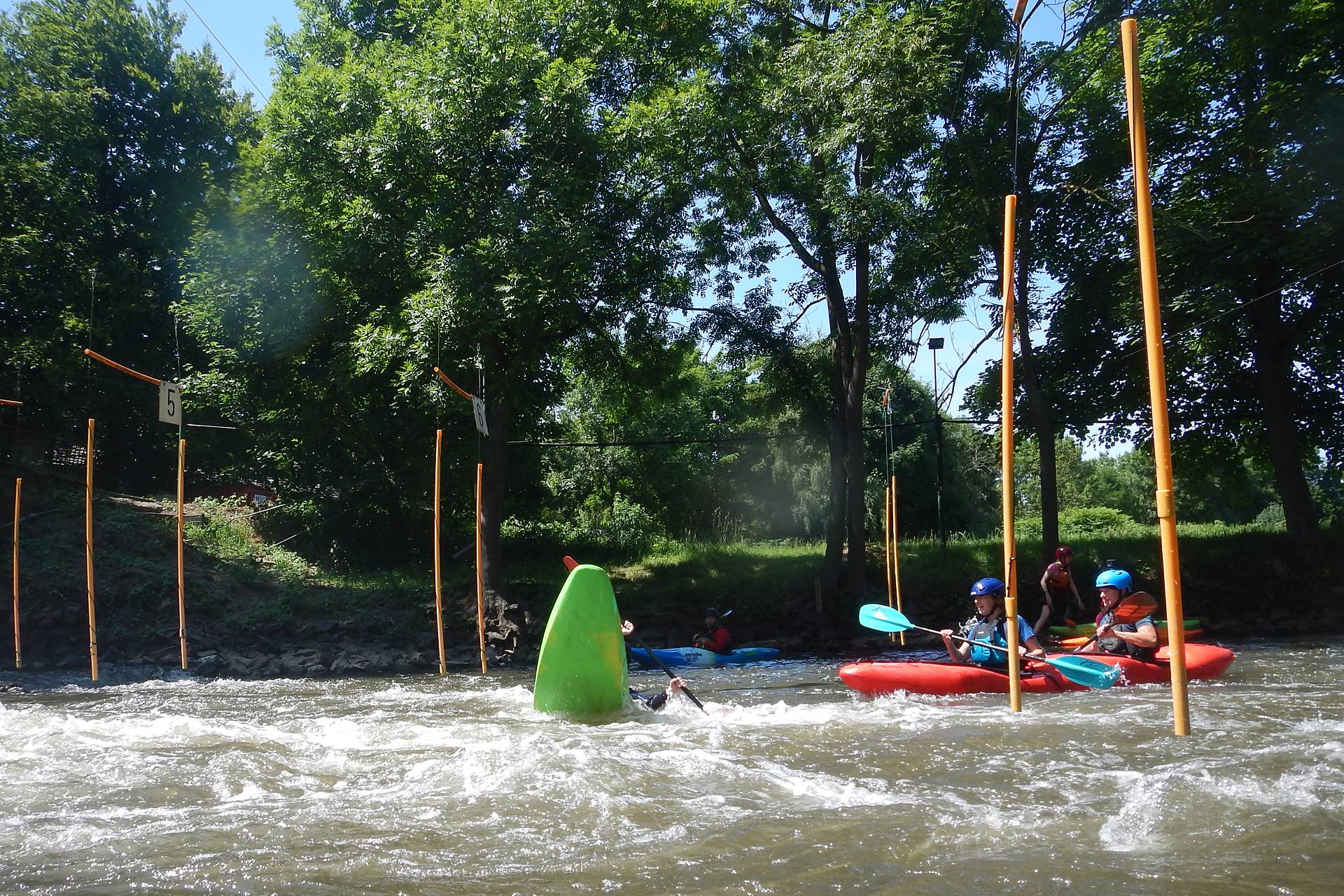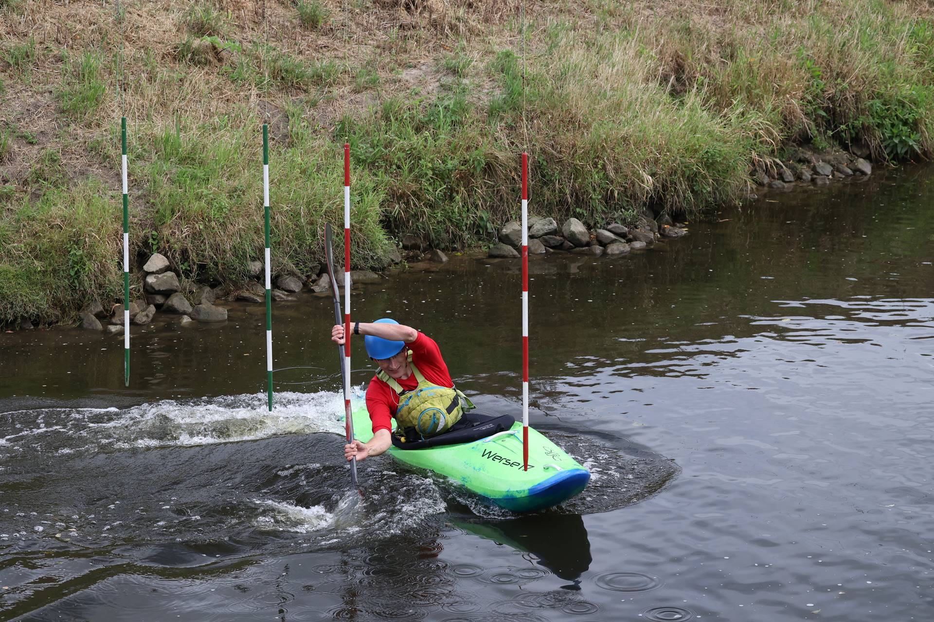 Für den Wettkampf galt es auf Zeit im Kajak einen Parcours zu absolvieren, bei dem zuerst eine in ca. 150 m platzierte Boje umrundet werden musste, auf dem Rückweg hieß es dann erst ein Aufwärts- und danach ein eng daneben hängendes Abwärts-Slalomtor zu durchfahren, um schließlich im Endspurt noch durch zwei weitere Aufwärtstore ins Ziel zu paddeln. Die Zeit, die die Paddelnden für den Parcours benötigten, wurde jeweils gestoppt, und für Berührungen der Slalomstangen gab es - so wie im richtigen Slalom auch - noch Strafsekunden draufgerechnet.