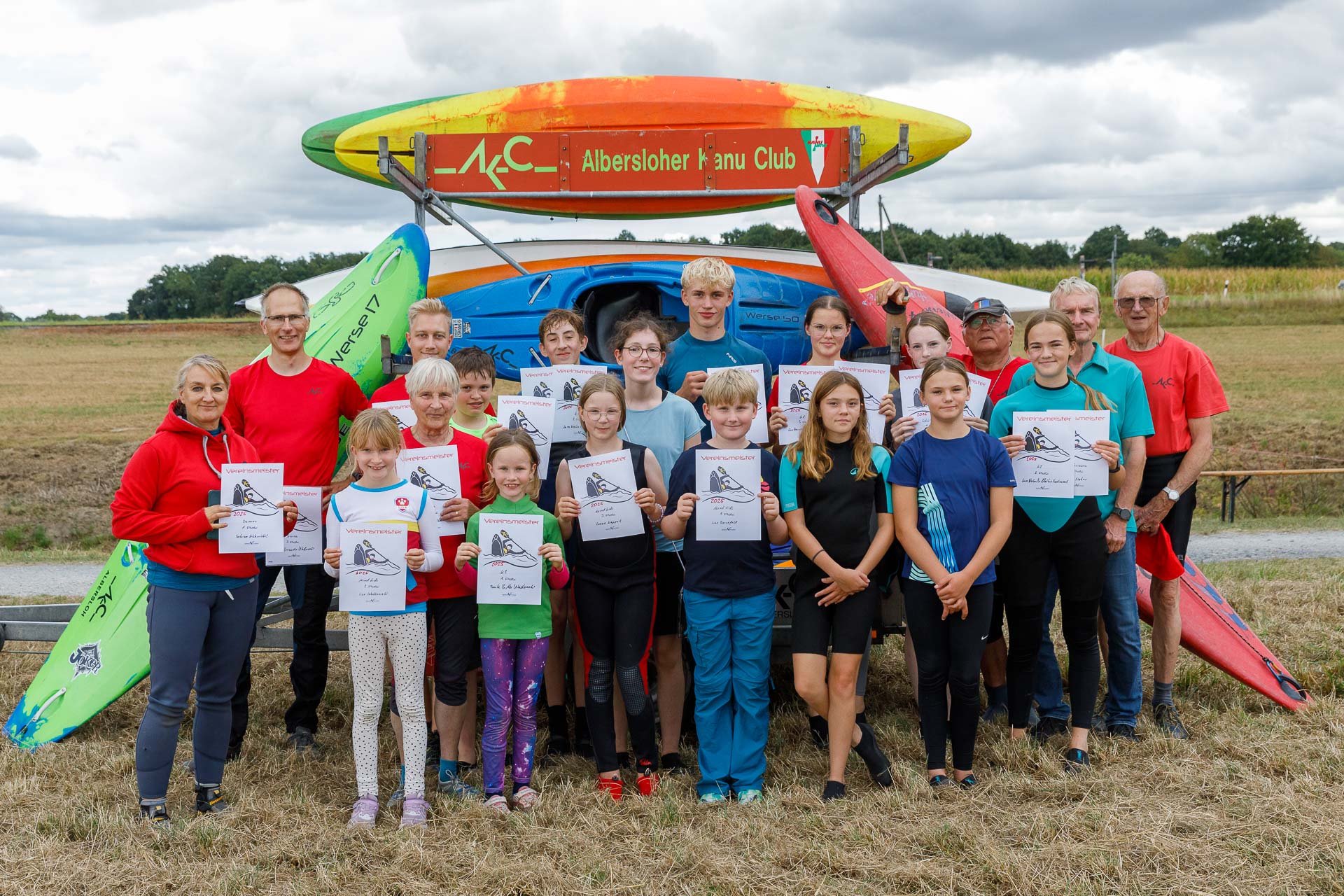 Mit dabei waren 35 Vereinsmitglieder, mit einer beachtlichen Altersspannbreite von zwei Monaten bis 82 Jahren. Dies zeigt sehr schön, dass Paddeln ein Sport für Jung und Alt ist. Der Jüngste war zugegebenermaßen nicht mit auf dem Wasser, aber alle anderen Kinder, von denen die Kleinsten noch nicht mal in den Kindergarten gehen, konnten mindestens eine Tour im Zweierkajak oder Canadier mitmachen. Alle Touren waren zudem so geplant, dass es kürzere Teilstrecken gab und man an den Pausenstellen aufhören konnte, wenn die Ausdauer nicht für die ganze Strecke ausreichte.