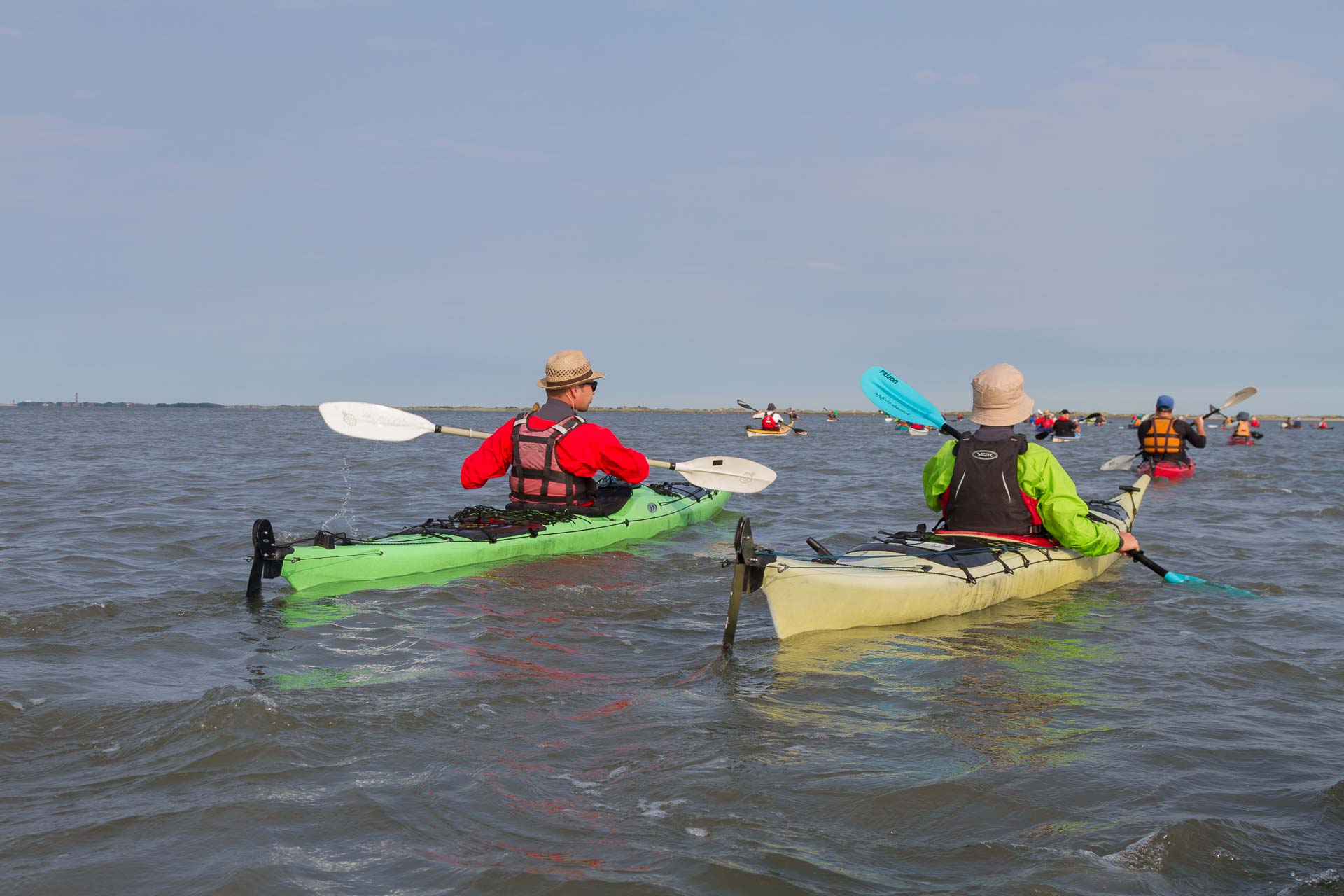 Die Wettervorhersage für die kommenden Tage hielt wenig Wind und keinen Niederschlag bereit, somit stand der Überfahrt nach Baltrum am Freitag nichts im Wege. Um die Tide optimal nutzen zu können, mussten die Kanuten hierfür früh aus den Federn. Schon um sieben Uhr fuhren sie nach Nessmersiel, um von dort auf die kleinste der ostfriesichen Inseln zu paddeln. Die fünf Kilometer lange Strecke hielt für die Kanuten gleich ein Highlight parat. Sie paddelten ganz nah an den Seehundbänken vorbei und konnten die Tiere in ihrer freien Wildbahn hautnah erleben. Manch einer war erstaunt wir zutraulich und neugierig die dickhäutigen Genossen sind. Es kam nämlich nicht selten vor, dass ein Tier direkt vor oder neben einem Kajak aus dem Wasser sah, um sich die "seltsamen bunten Boote" mal genauer anzusehen. Nach einem vierstündigen Aufenthalt auf der kleinen Insel begaben sich die Sportler in ihre Boote und fuhren mit der Flut wieder zurück zum Festland.