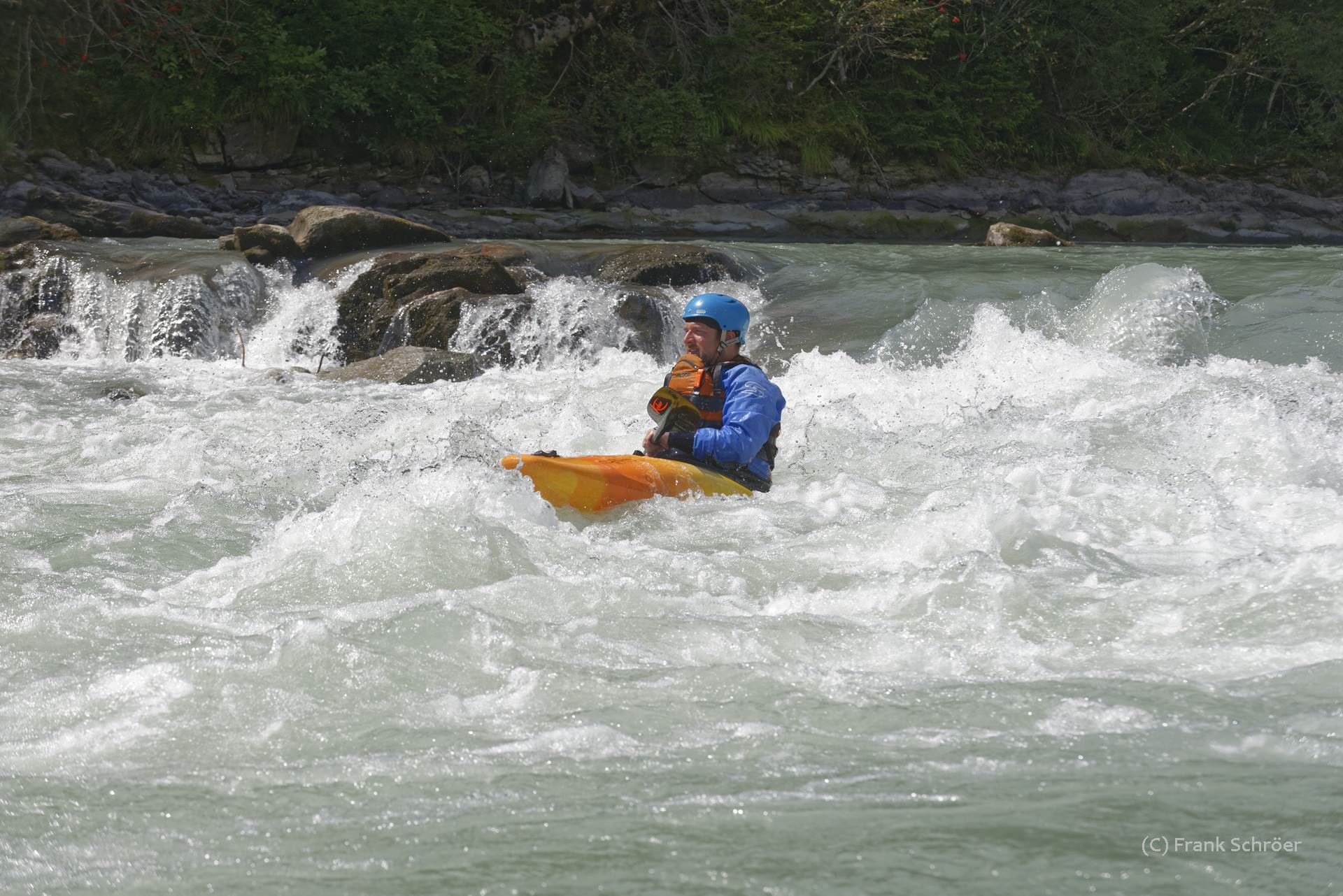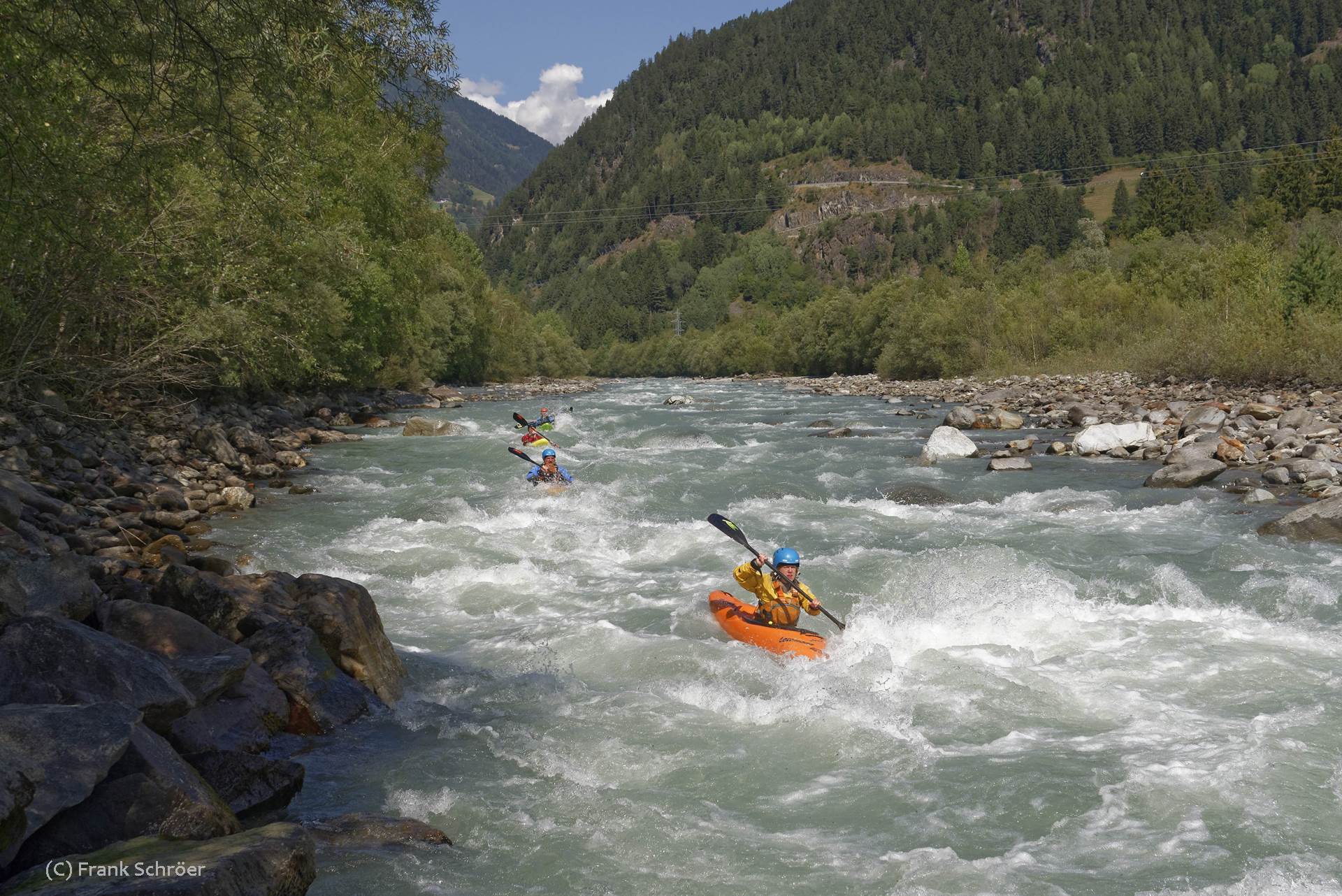 Zusammen mit drei weiteren Paddelfreunden ging es zunächst für eine Woche nach Meran. Dort wurden Etsch, Eisack und - nach nächtlichem Regen - von einigen als „Nachmittagsverabredung“ auch noch die direkt am Campingplatz vorbeifließende Passer gepaddelt. Auch weil aufgrund der niedrigen Wasserstände nicht viel mehr gepaddelt werden konnte, ging es nach einer knappen Woche weiter nach Lienz. Auf dem Weg dorthin wurde ein kleiner Zwischenstopp eingelegt, um den Ahrnbach noch als „Reisebach“ mitzunehmen. In Lienz standen dann Paddeltouren auf Drau, Isel, Möll und Lieser auf dem Plan. Doch auch in Lienz hatten die Flüsse angesichts des phänomenalen Sommerwetters nicht mehr allzuviel Wasser. Selbst die sonst recht wasserreiche Isel hatte jeden nächsten Tag einen noch niedrigeren Wasserstand und es kamen Steine zum Vorschein, die auch die Paddler der Gruppe, die schon häufiger auf der Isel waren, noch nie zuvor gesehen hatten.