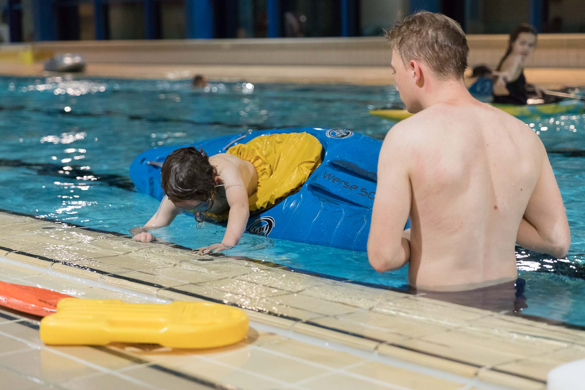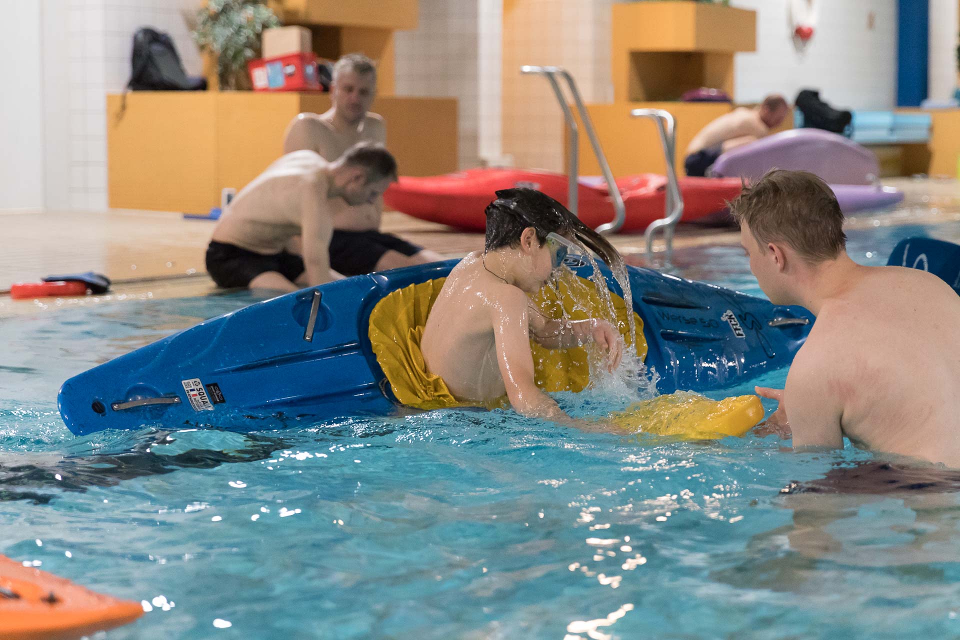 Zum Glück können wir jeden Freitag das Schwimmbad in Sendenhorst für unser Wintertraining nutzen. Hier können wir in geschützter Umgebung und warmem Wasser das Austeigen nach einer Kenterung üben, die wichtigste Technik im Kajaksport. Erst wer dies sicher beherrscht, darf bei uns mit geschlossener Spritzdecke paddeln.