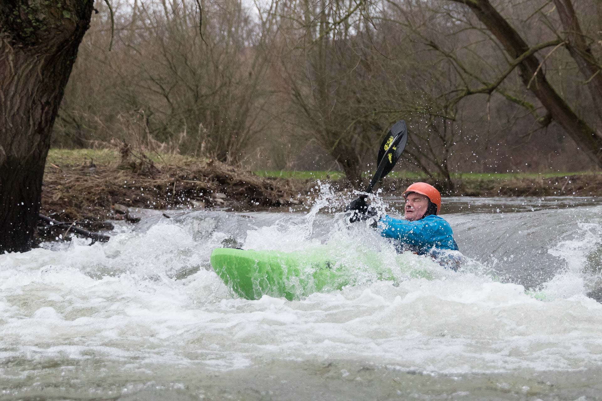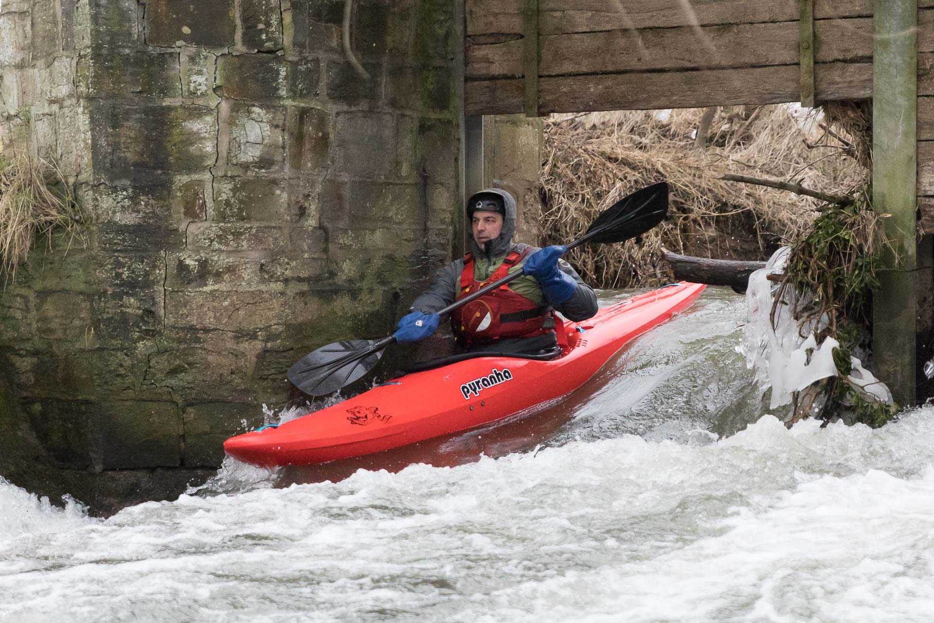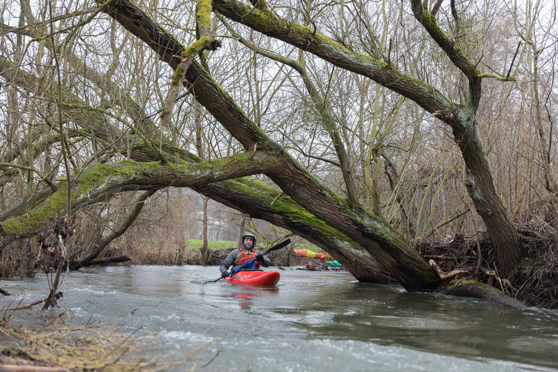 Das Anziehen der Paddelsachen war bei Schneeregen nicht gerade gemütlich; aber wie sagt man so schön, es gibt kein schlechtes Wetter, sondern nur schlechte Kleidung. Also noch schnell einen Fleece mehr unter der Paddeljacke angezogen und los ging's. Die starken Winterstürme hatten den ein oder anderen Baum entwurzelt. Bei diesen Baumhindernissen muss man einschätzen, ob man evtl. mit Schung über den Baum fahren kann oder an der Seite drunter durch kommt. Hierbei gilt es immer die Strömung zu berücksichtigen, sodass man nicht versehentlich unter dem Baum stecken bleibt. Manchmal heißt es dann auch "umtragen", um kein Risiko einzugehen.