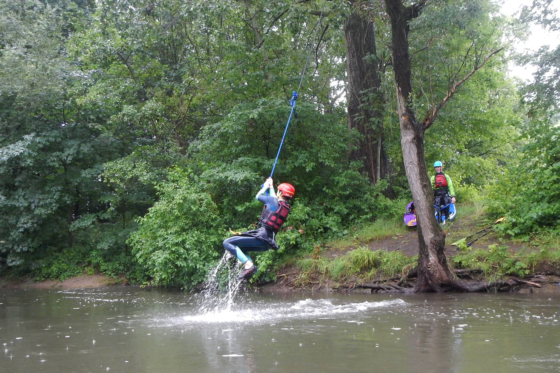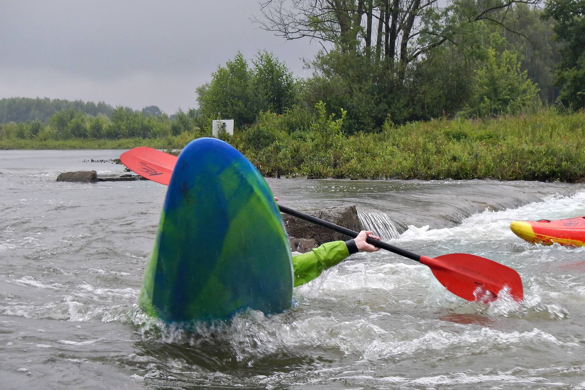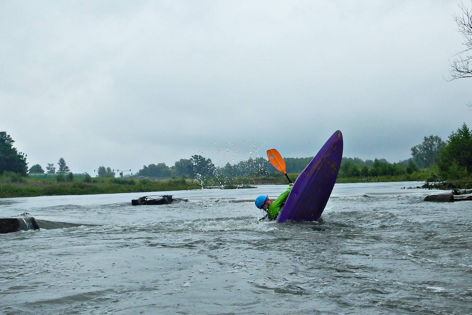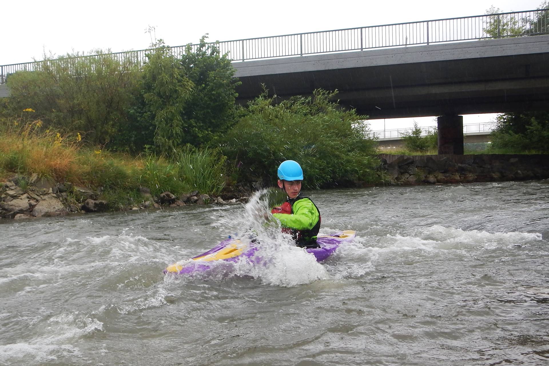 Der Dauerregen bedeutete zugleich einen guten Wasserstand und so wurde sofort die erste passende Stelle ein wenig zum Aufwärmen fürs Kehrwasserfahren, Wellesurfen oder Kerzen genutzt. Am kurze Zeit später folgenden S-förmigen Schwall verweilte die Gruppe etwas länger, denn dank des Wasserdrucks machte das Kerzen hier noch mehr Spaß.