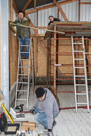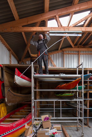 Heute haben wir die Arbeiten von letztem Samstag fortgesetzt: Das Bootsregal wird etwas größer als im alten Bootshaus, deshalb mussten wir die Träger auf denen die Boote liegen verlängern. Damit wir den Platz über den liegenden Booten auch als Lagerfläche nutzen können, haben wir das Regal von oben verkleidet. Dazu mussten noch einige Verstärkungen montiert und die Bodenplatten aufgeschraubt werden.