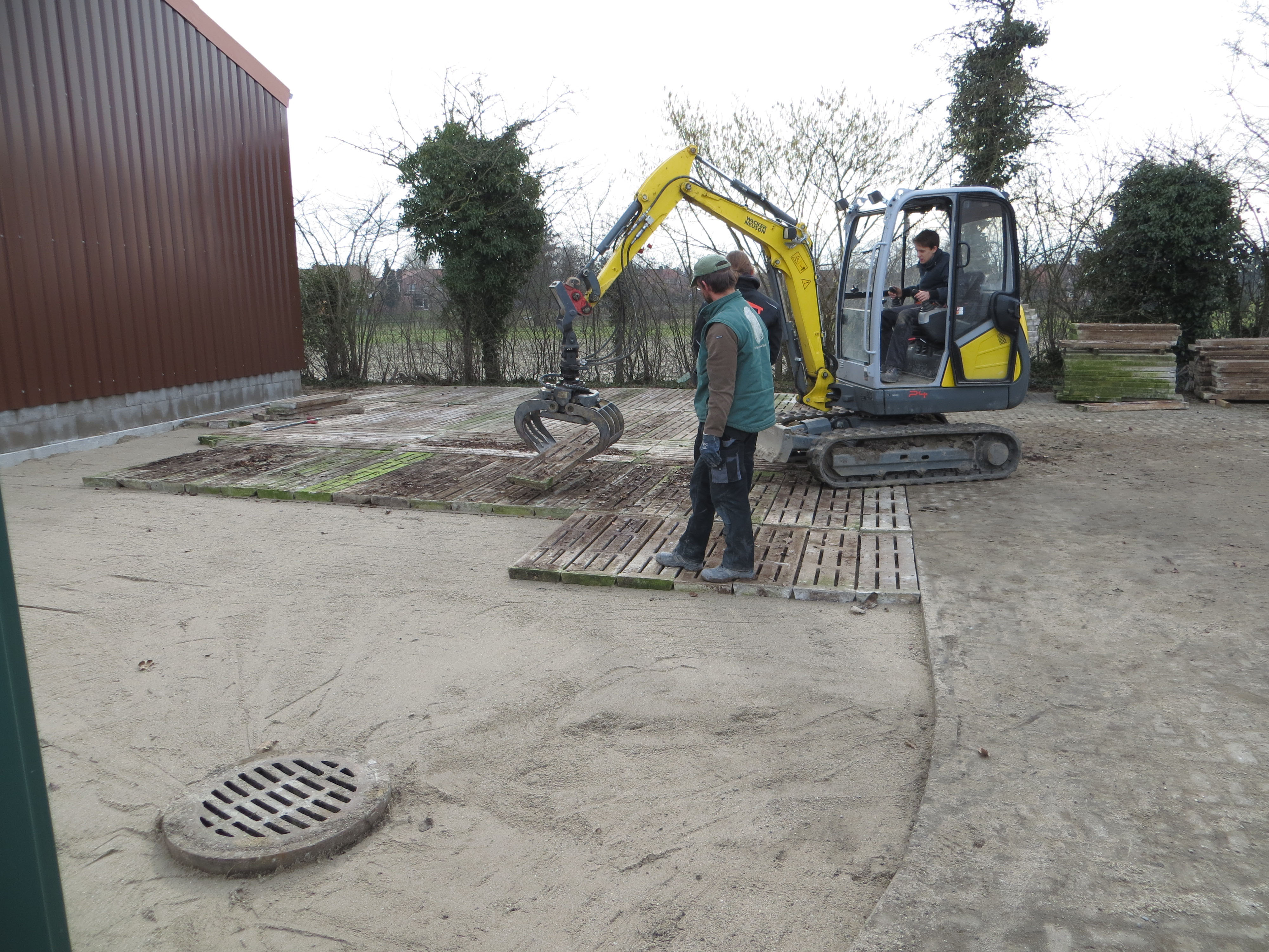 Heute haben wir die benötigten Parkplatzflächen vor dem Bootshaus erstellt. Schon gestern hat die Firma Rehbaum Gartengestaltung die erforderlichen Flächen ausgekoffert, sodass wir heute in Eigenregie und mit vereinter Muskelkraft die weiteren Arbeiten vornehmen konnten. Unser Wanderwart Dirk hatte Spaltenböden gespendet, die wir als Befestigung für die Flächen nutzen konnten.